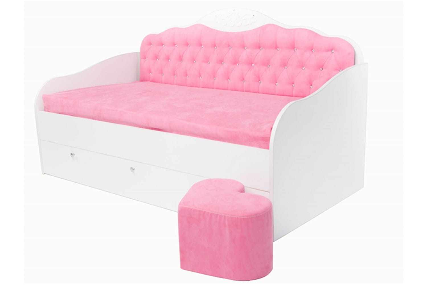 Отделка велюр и стразы. Стильный дизайн.Выкатной ящик продается отдельно.Валики и подушки и матрас в комплектацию не входят.