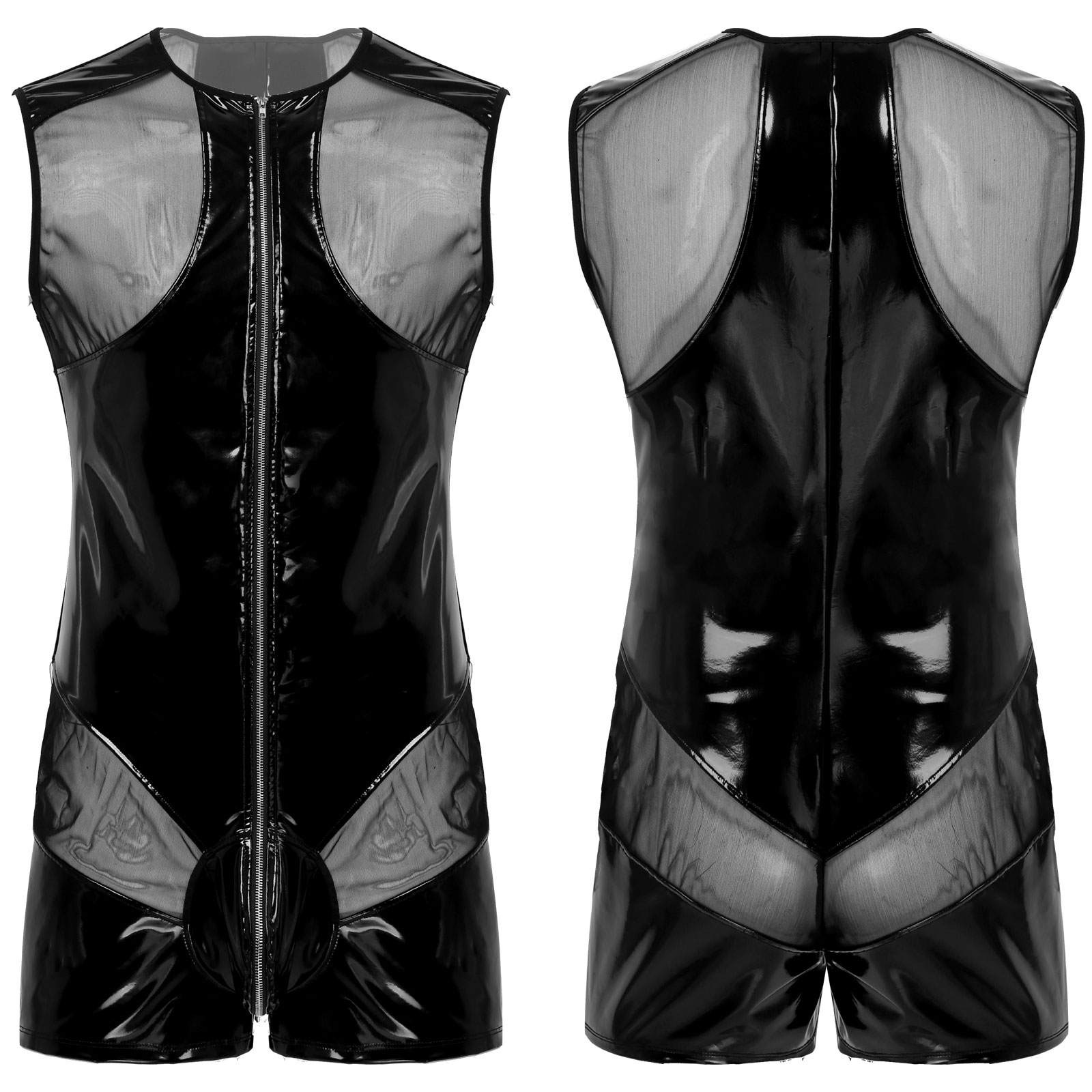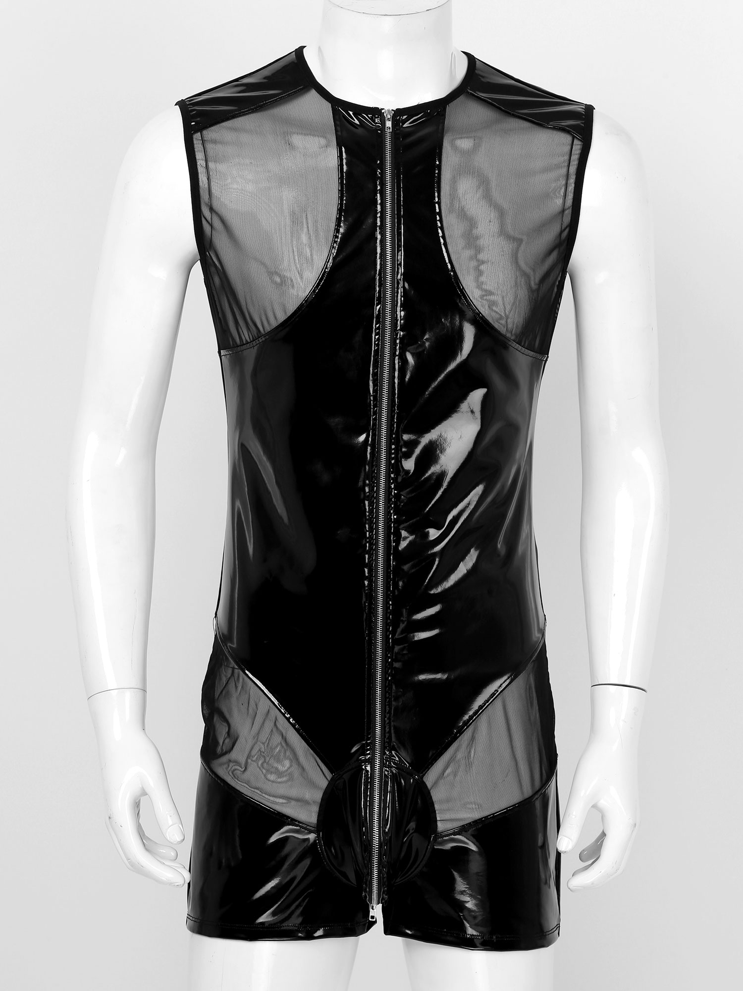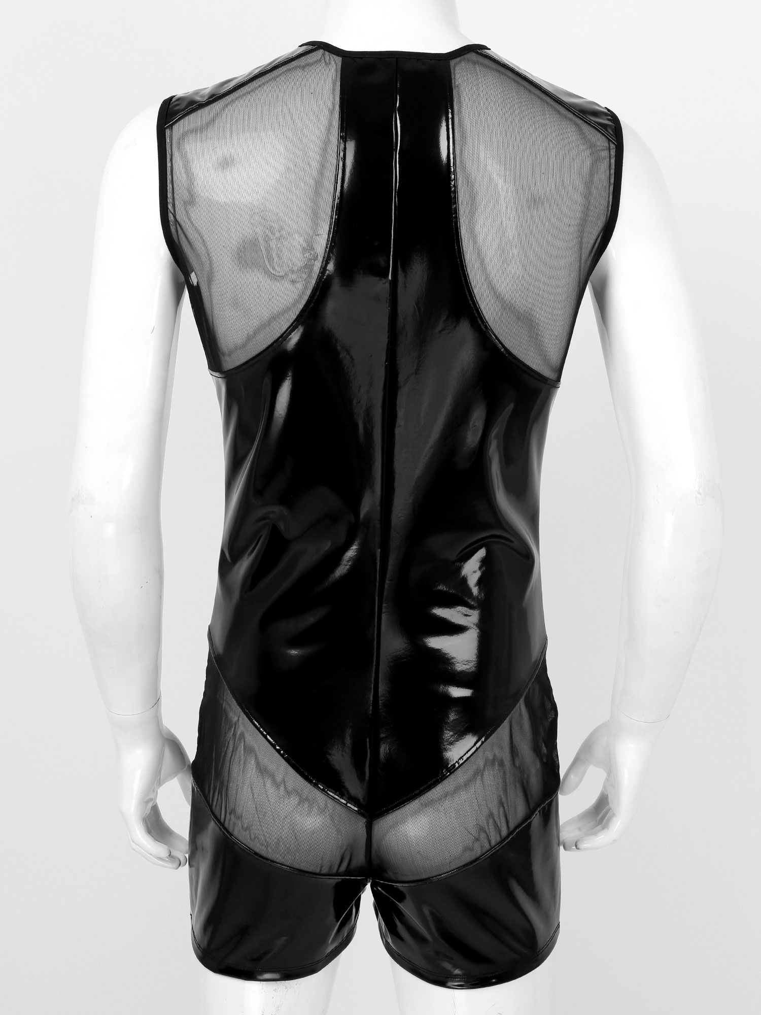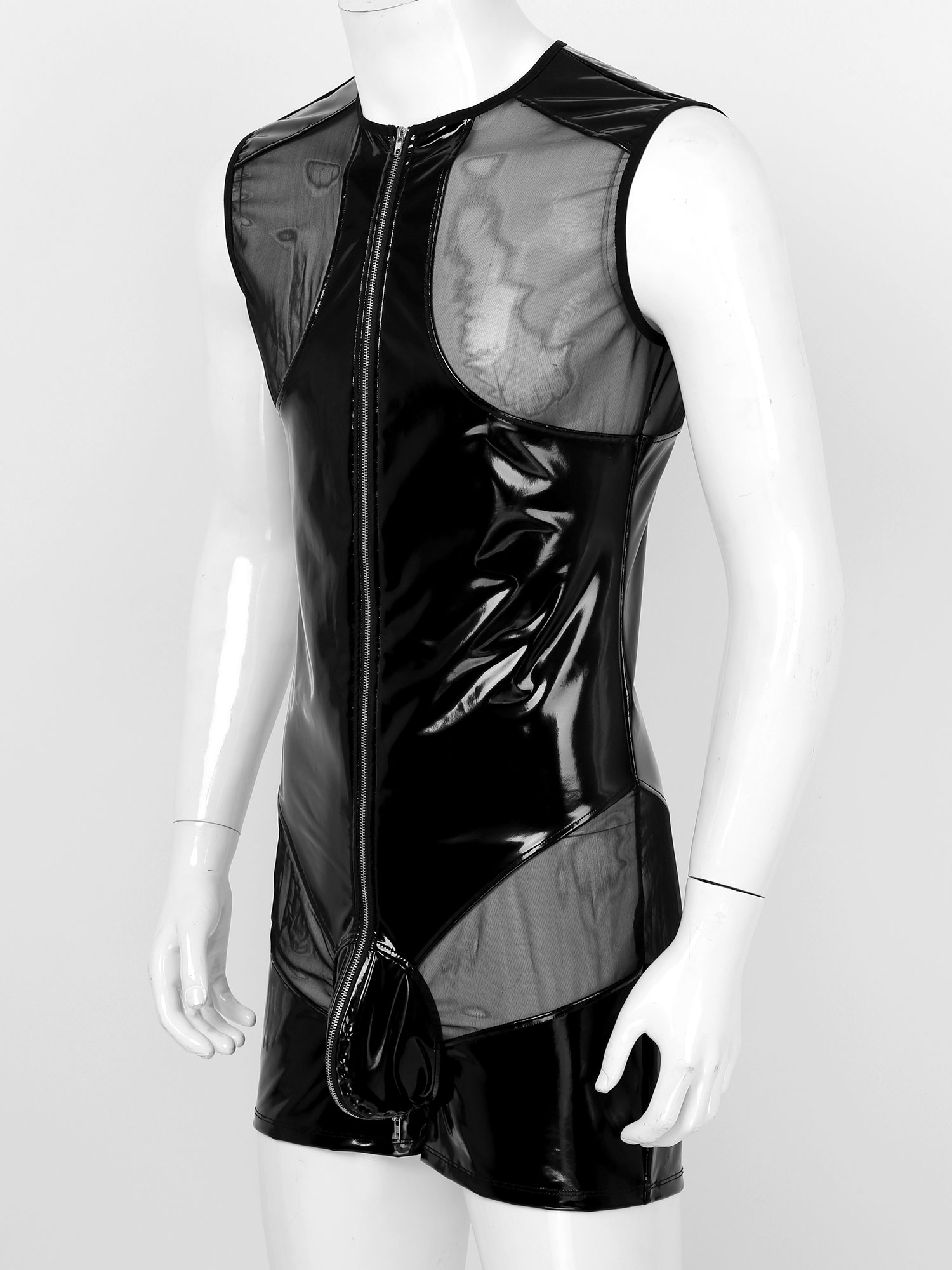 Мужской короткий комбинезон из лакированной кожи с прозрачной сеткой и круглым вырезом без рукавов на молнии.