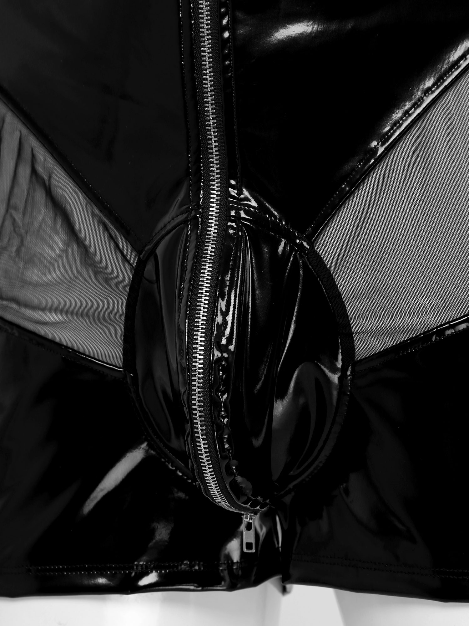 Лакированная кожа с влажным внешним видом и прозрачная сетка в стиле пэчворк, идеально подчеркивает изгиб мышц вашего тела.
