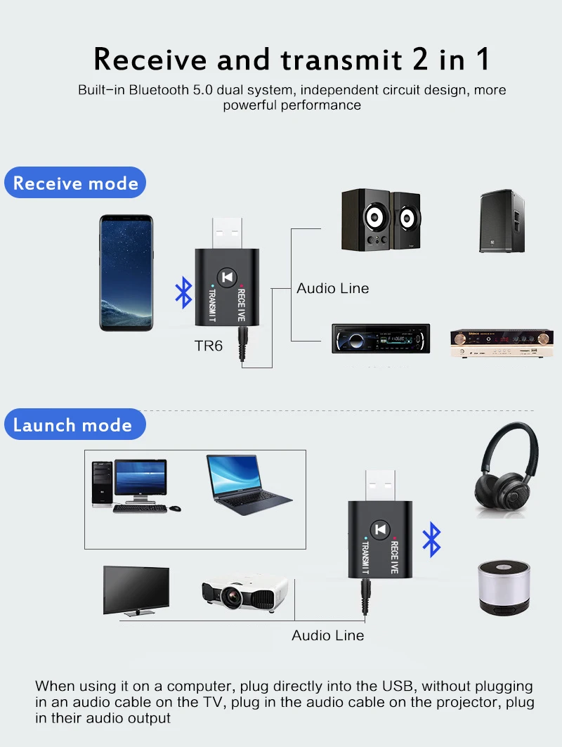 В режиме передатчика Включите Bluetooth-телевизор, ПК, CD-плеер для iPod, MP3 / MP4 в Bluetooth-передатчик. Режим приемника: идеально подходит для домашней или автомобильной музыкальной потоковой звуковой системы.