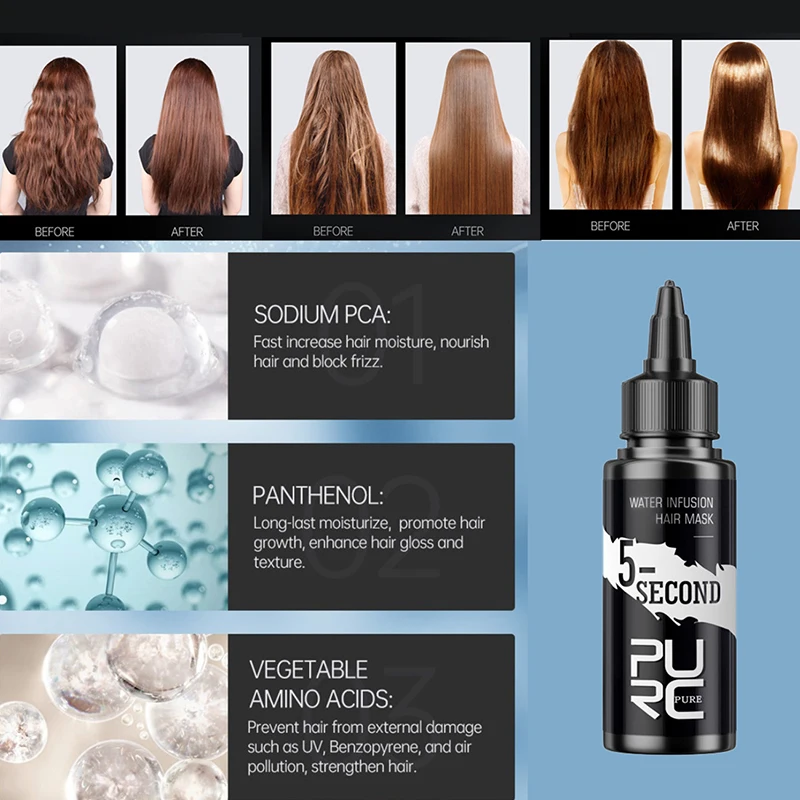 1 секунда, 5 секунд проникновения, струящаяся жидкость быстро проникает в каждую прядь волос, осознавая, что каждый волос становится мягким.