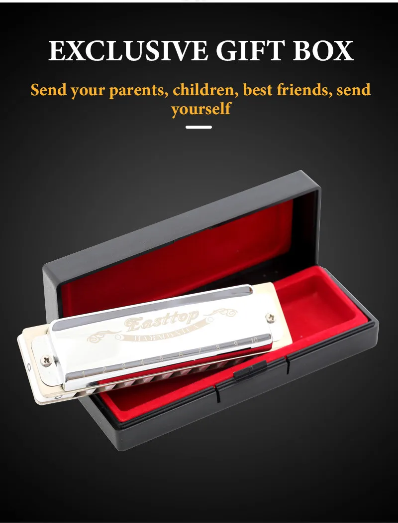 10 Hole Diatonic Harmonica D -Premium Quality Materials and Elegant Looking: Well made with phosphor bronze reed with brass covering and ABS resin comb, it has a great sound and comfortable to the lips when played.
