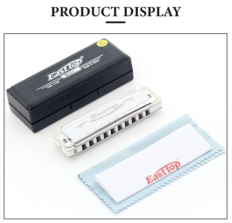 EASTTOP Diatonic Blues Harmonica Key of D, 10 Holes Diatonic Blues Harp Mouth Organ Harmonica with White Cover, T008 Harmonica for Adults, Professionals and Students