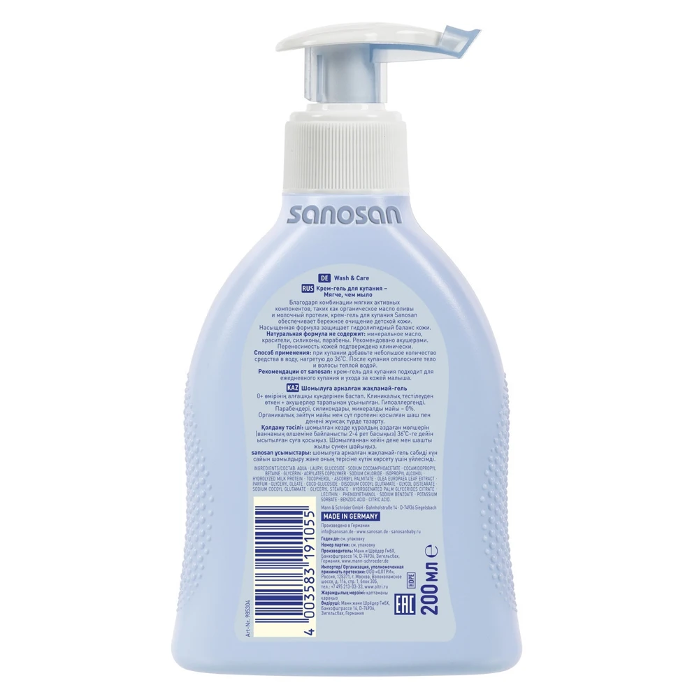 Благодаря комбинации мягких активных компонентов, таких как органическое масло оливы и молочный протеин, крем-гель для купания Sanosan обеспечивает бережное очищение детской кожи.