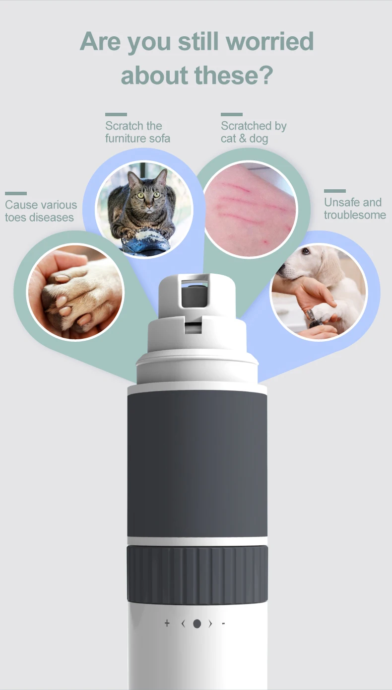 Оснащенный тремя портами и бесступенчатым переключателем регулирования скорости, триммер широко применяется для маленьких, средних домашних животных с гвоздями разного размера. Вы можете выбрать подходящий порт и скорость в зависимости от размера и твердости ногтей вашего питомца для шлифования ногтей.