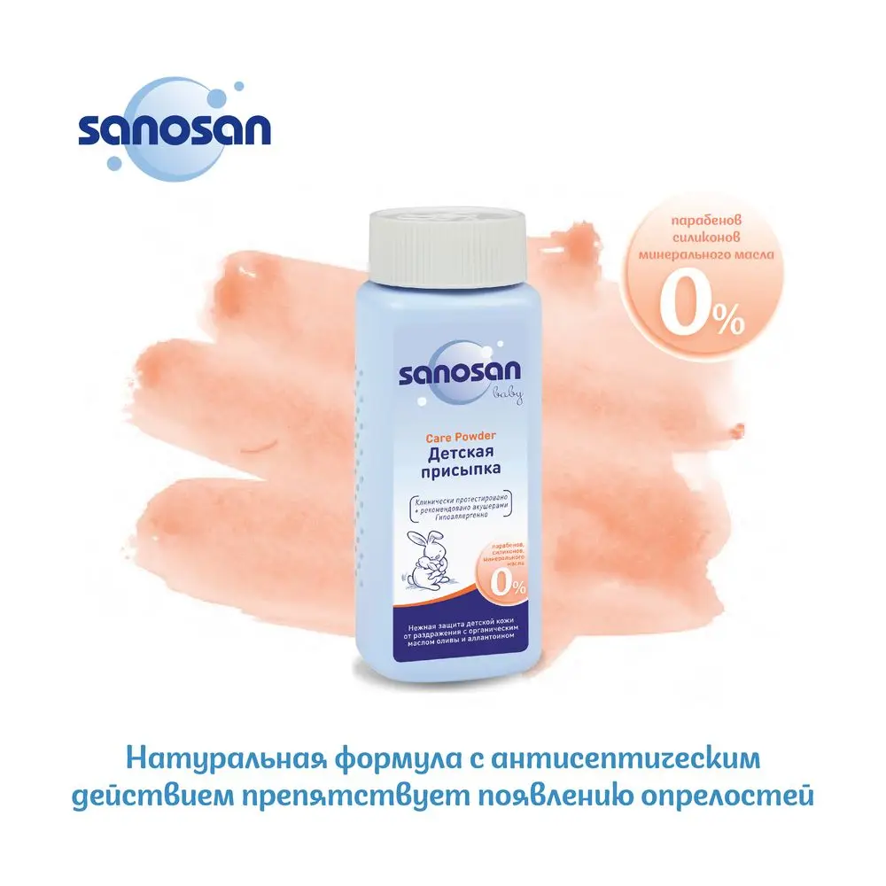 Детская присыпка Sanosan для защиты кожи от раздражения с органическим оливковым маслом и аллантоином.
