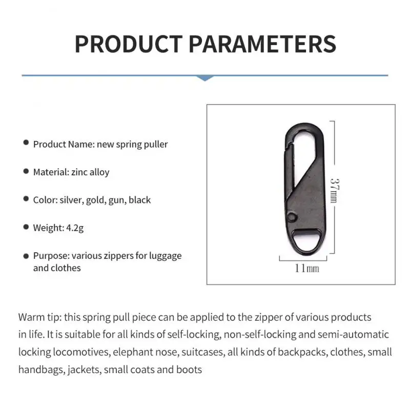 Эта пружинная тяга может быть применена к молниям различных продуктов в жизни, подходит для различных самоблокирующихся, не самоблокирующихся, полуавтоматических локомотивов, стволов слона и т. Д., багажа, различные рюкзаки, небольшие клатчи, куртки, маленькие пальто, ботинки и т. Д.