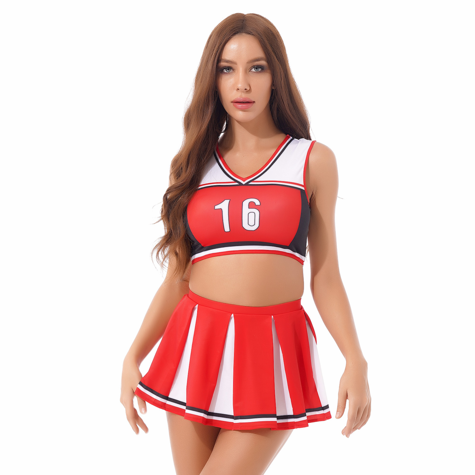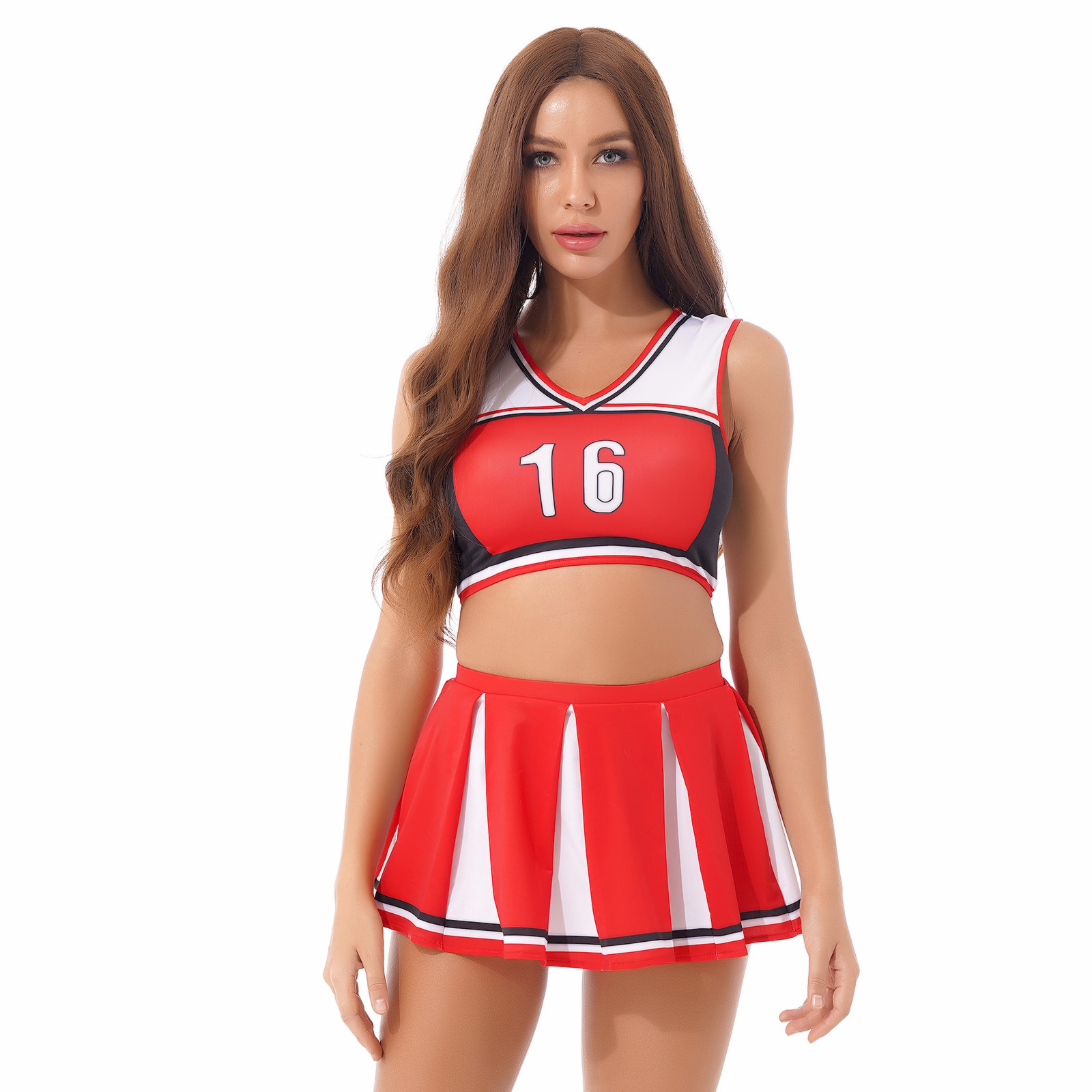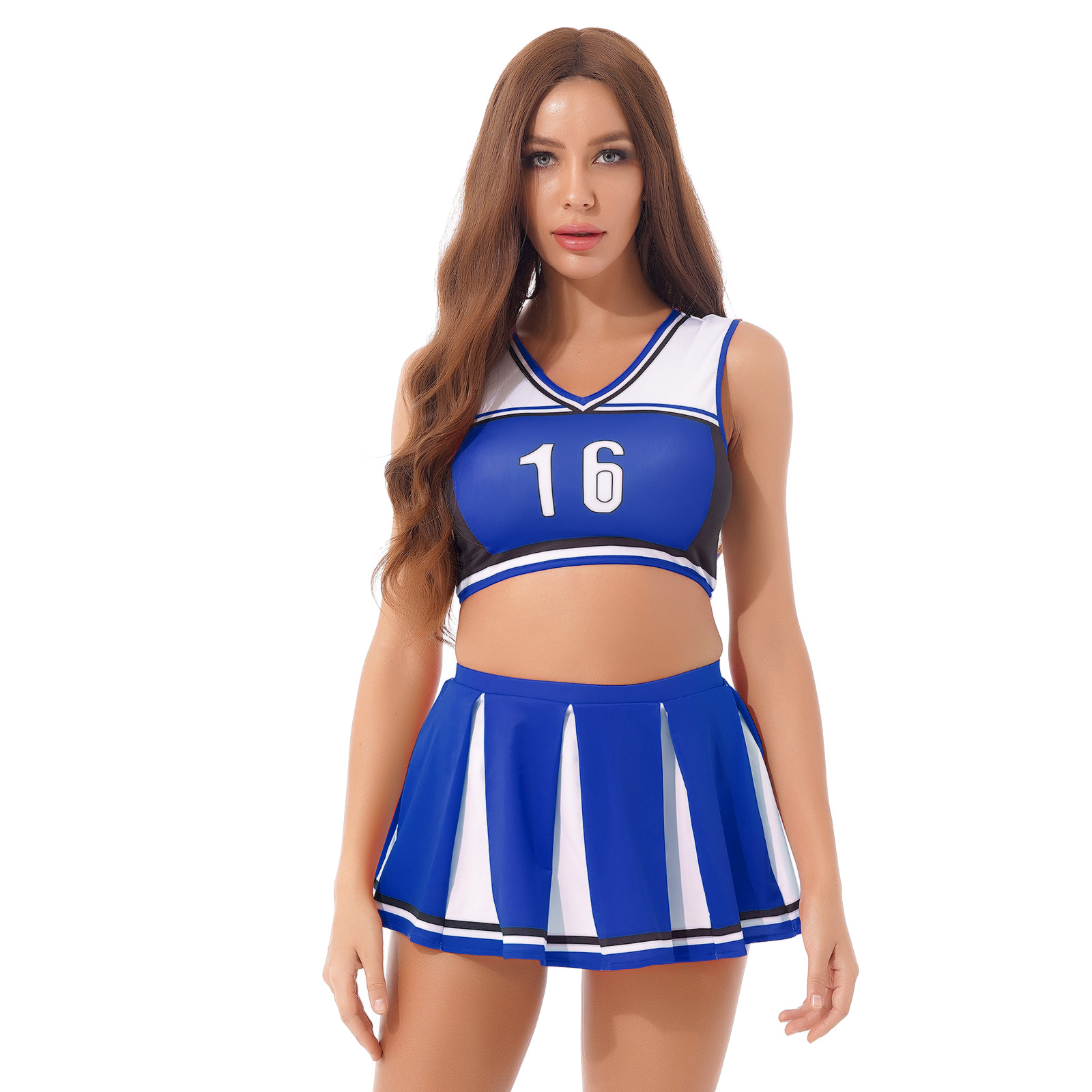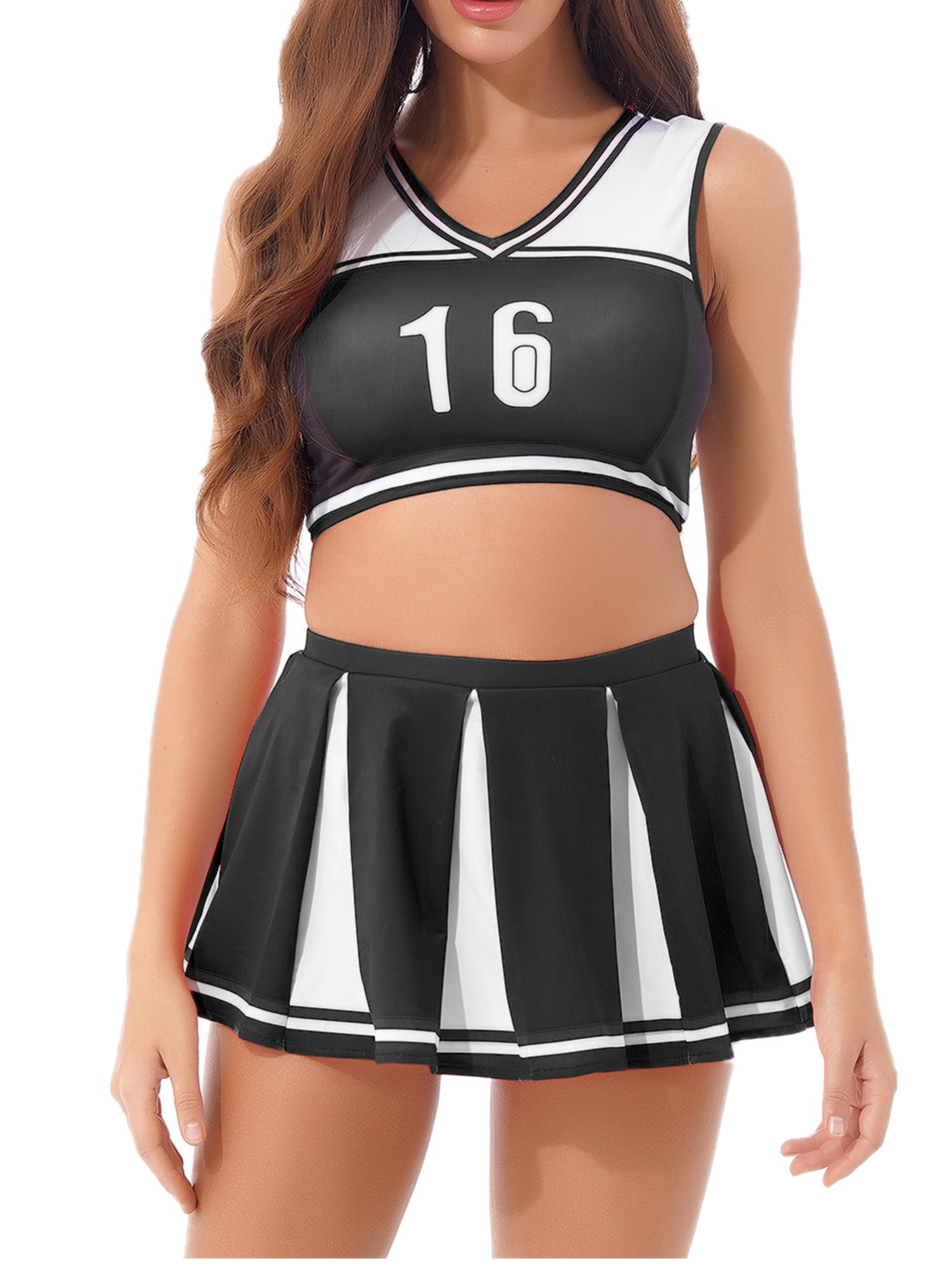Костюмы для Черлидинга включают короткий топ без рукавов с буквенным принтом и v-образным вырезом и плиссированную юбку.