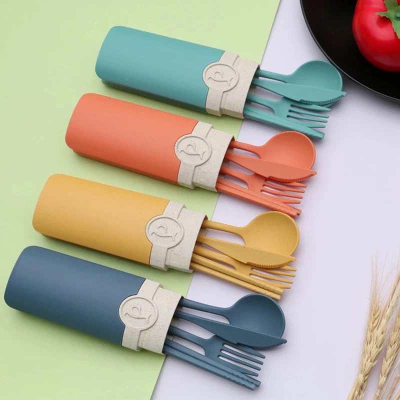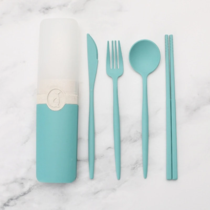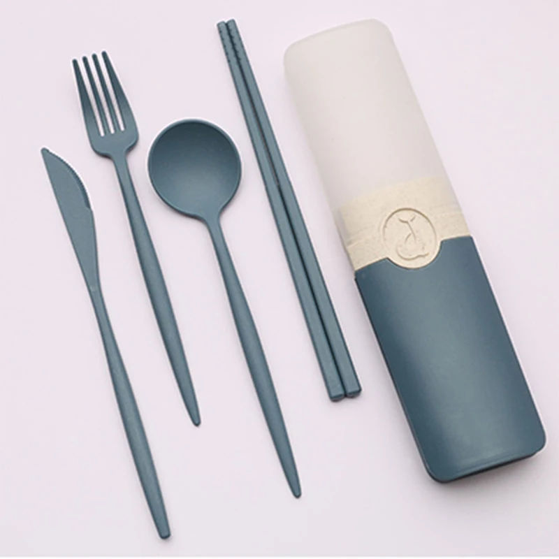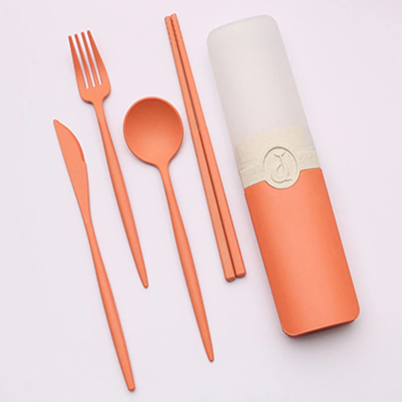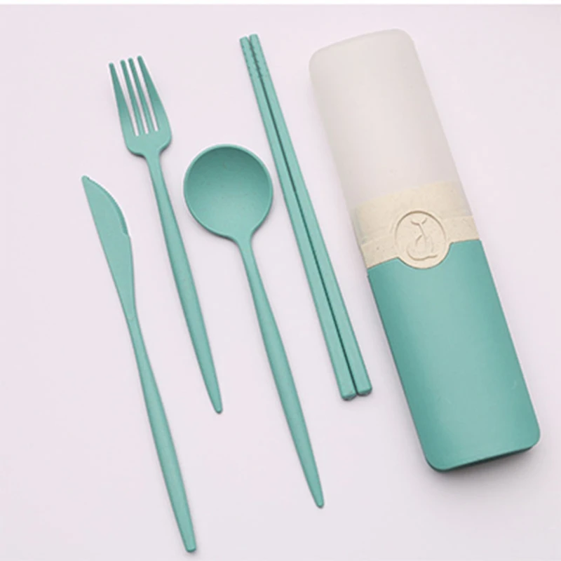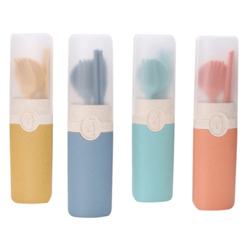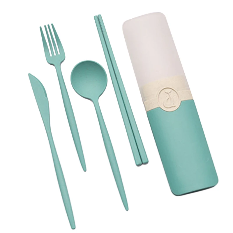 Портативная многоразовая Ложка Вилка дорожная китайские палочки для пикника набор столовых приборов из пшеничной соломы с футляром для студенческого офиса