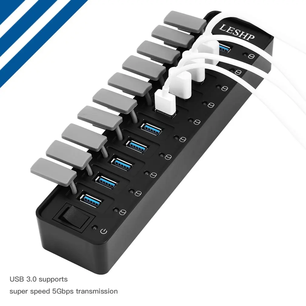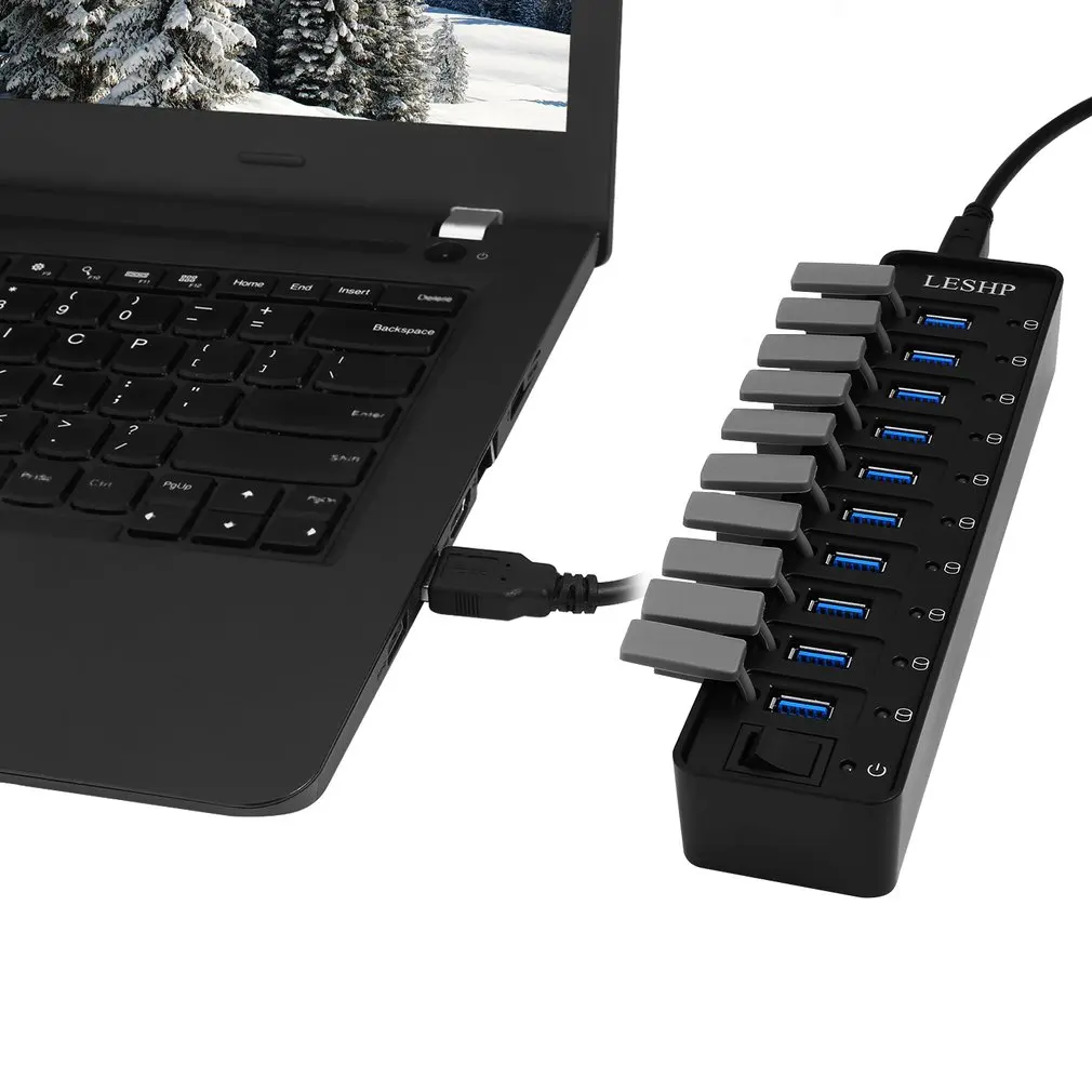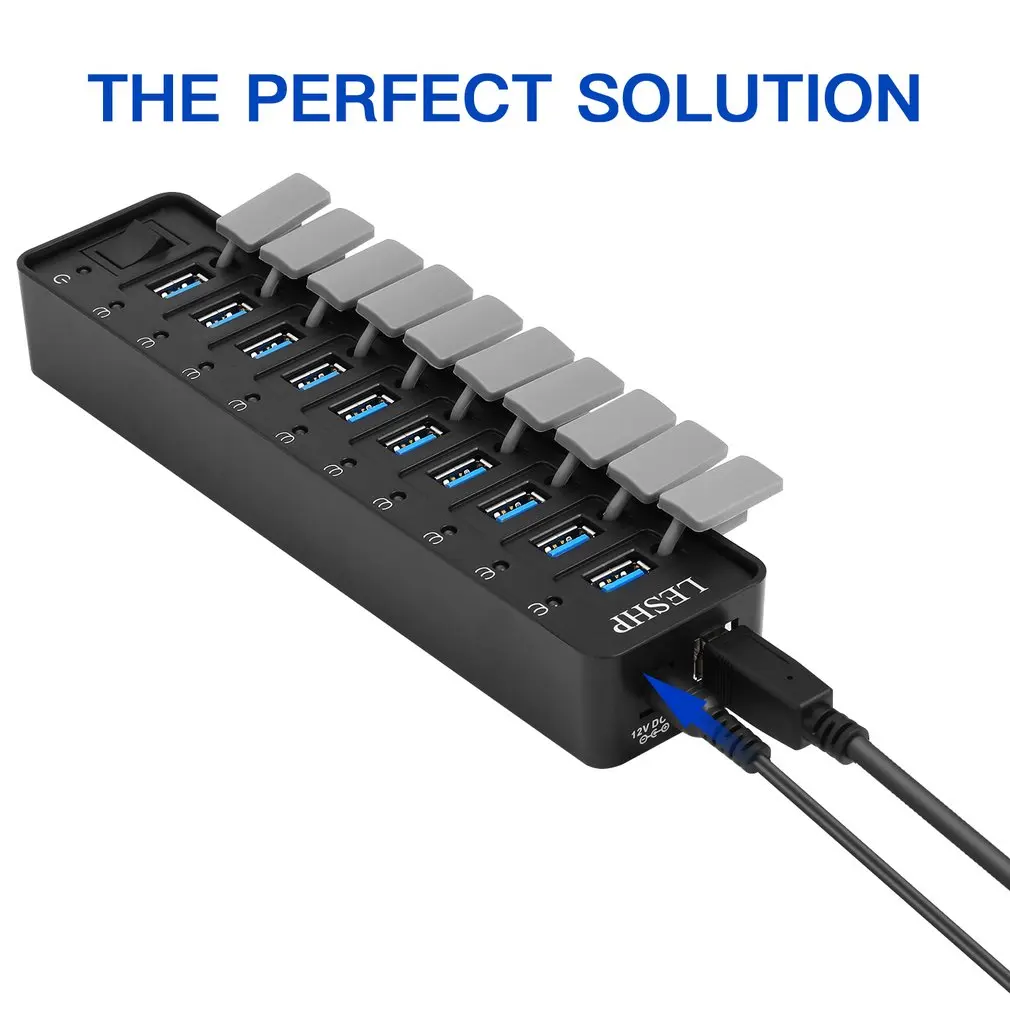 10 портов USB 3,0 концентратор Высокоскоростной 5 Гбит/с USB 3,0 концентратор данных разветвитель с светодиодный и переключатель внешний адаптер питания для ПК ноутбука США вилка