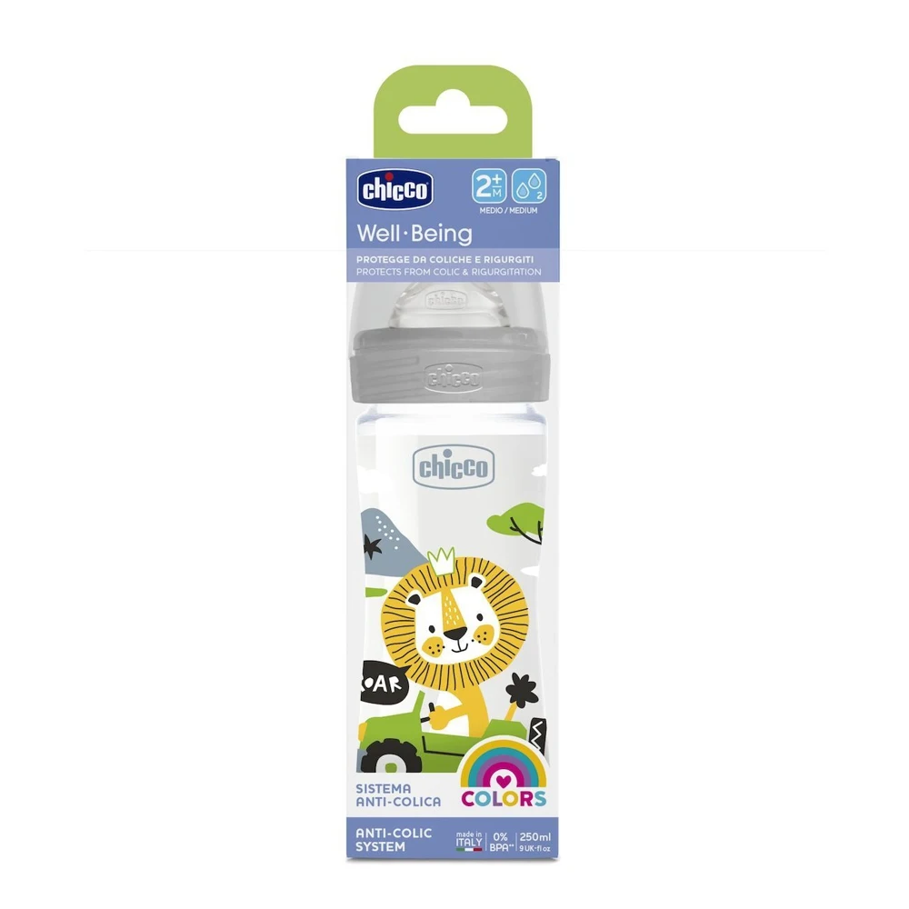 Бутылочка для кормления Chicco Well-Being Uni 250 мл. с силиконовой соской средний поток, для детей с 2-х месяцев.