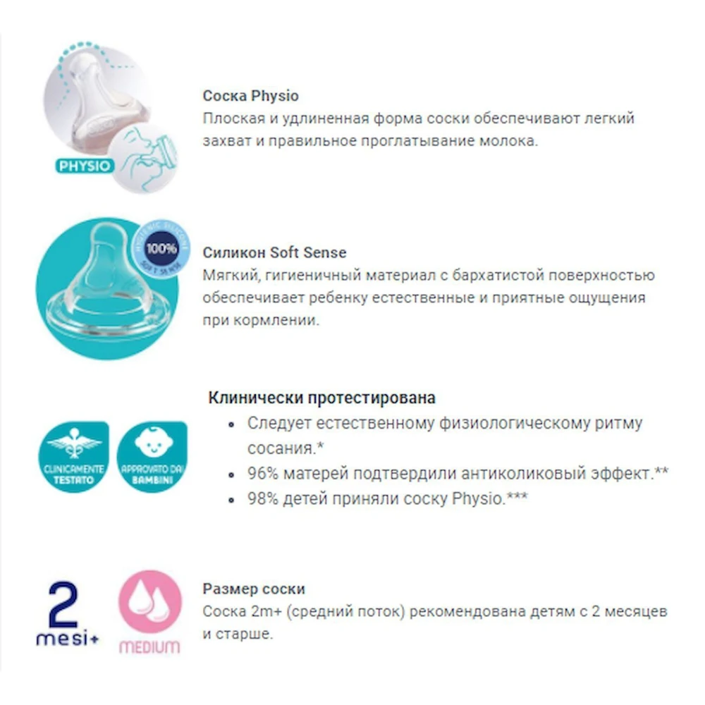 Антиколиковый клапан предотвращает всасывание воздуха и сокращает риск колик;