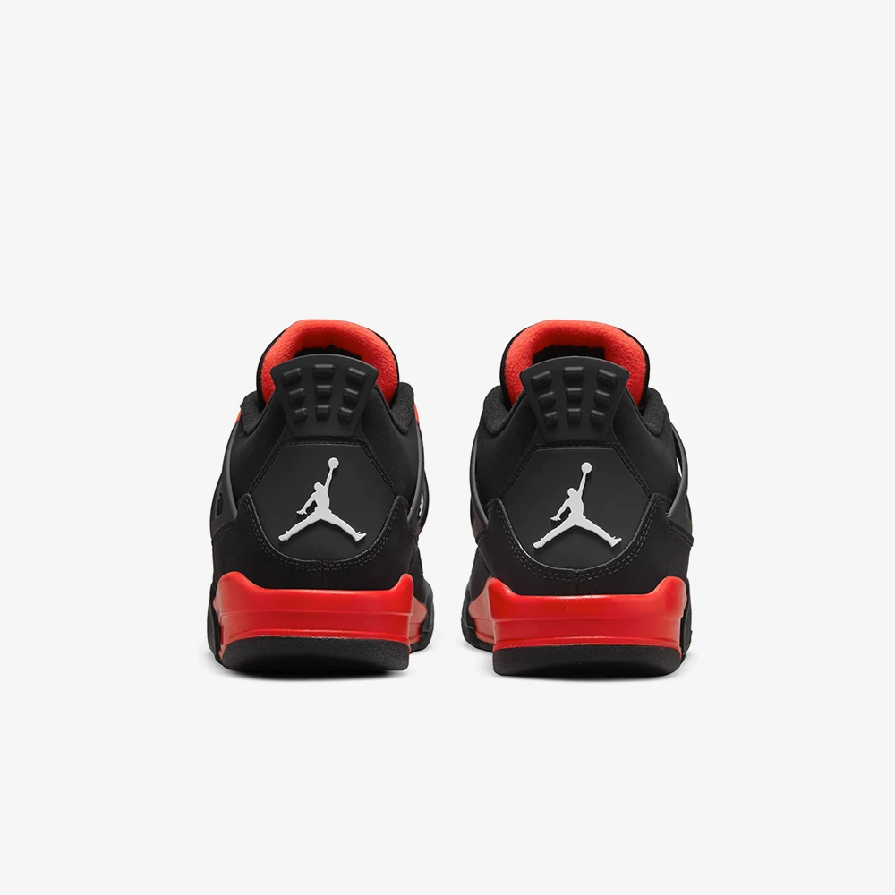 Детские кроссовки в стиле ретро с принтом «Красный Гром», группа цветов Air Jordan 4. Топ-часть черный нубутан изготовленный и ярко-красные акценты были завершены. Края, четвёртые пластины отличаются фирменными сетевыми вставками.