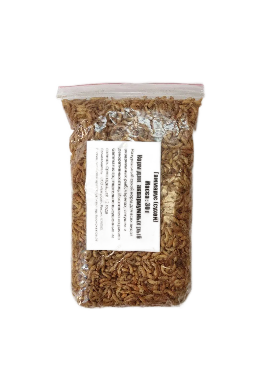 В живом виде гаммарус нередко может быть переносчиком рыбьих паразитов. Но сухой корм, производимый компанией Барром, совершенно безопасен для ваших рыбок, поскольку он обеззаражен. В составе Gammarus доля белка – 56,2%, жиров 5,8%, а углеводов 3,2%. Гаммарус сухой успешно используется для выращивания пресноводных и морских рыб, а также в качестве подкормки для декоративных птиц и молодняка в промышленном птицеводстве. Он считается одним из важнейших видов биосырья водного происхождения.