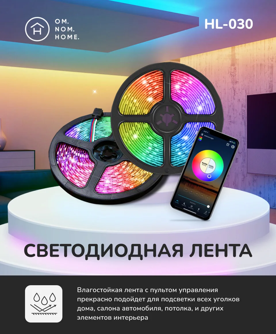 Влагостойкая лента с пультом управления. Прекрасно подойдет для подсветки всех уголков дома, салона автомобиля, потолка, и других элементов интерьера. Есть возможность регулировки яркости светодиодов с помощью пульта управления. 1.6 млн цветов - выбор цвета с телефона через приложение для iOS и Android. Клеевая прослойка с двойной клеевой лентой, дает возможность легкого закрепления на почти любой поверхности и в различной форме.