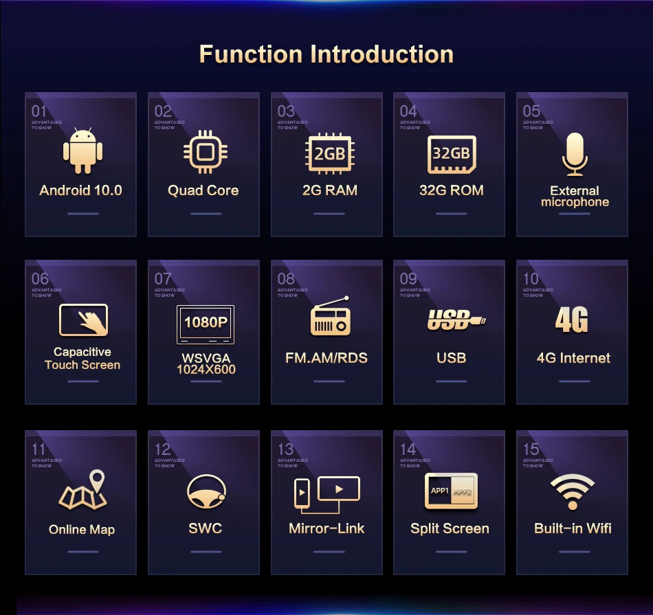 Сенсорный экран + радио + FM/AM + RDS + gps-навигация + карта + Wifi + Bluetooth + управление рулевым колесом + сплит-экран + USB + SD + AUX вход/выход + зеркальная ссылка + задний камера + сабвуфер + Play Sore + EQ + набор обоев + логотип автомобиля + 3G/4G + TPMS + DAB + OBD 2 + DVR + TV