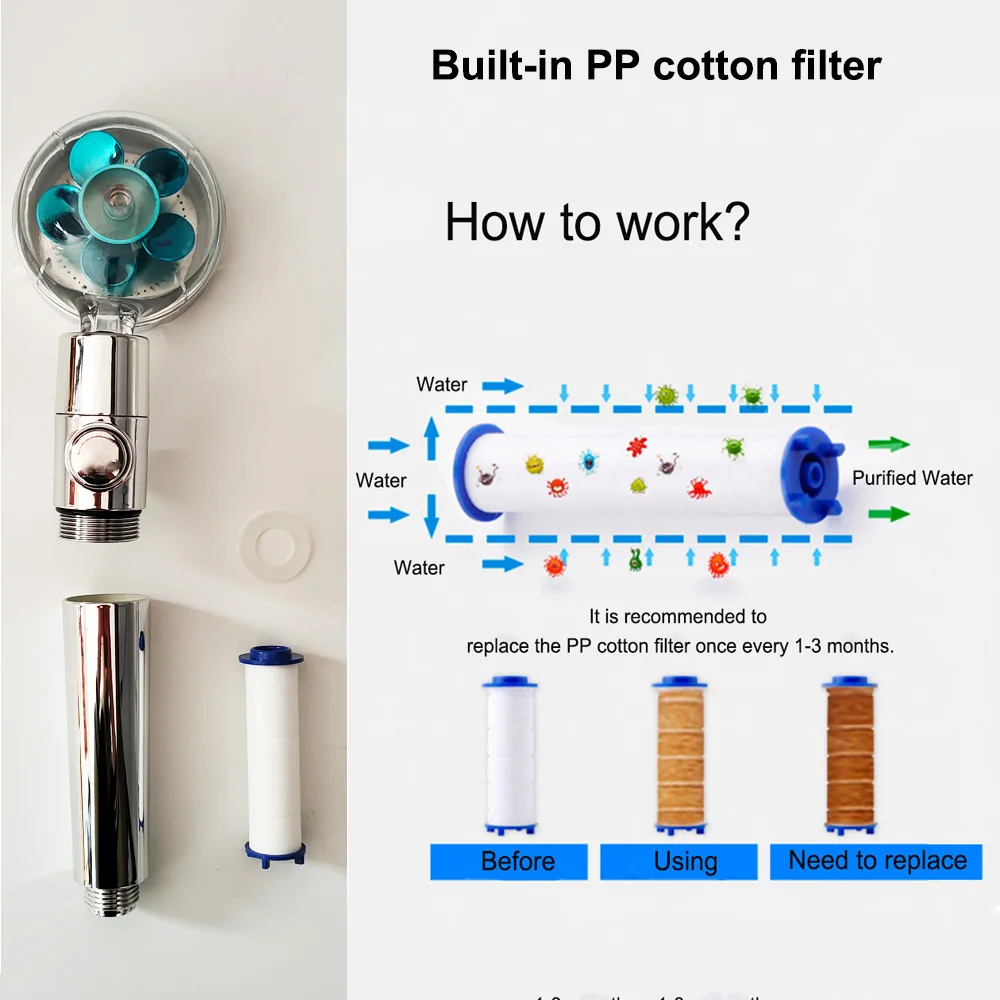 * Уникальная конструкция лопасти вентилятора увеличивает давление воды и приносит вам удовольствие. Он очень подходит детям, привлекает внимание детей и позволяет им принимать душ.