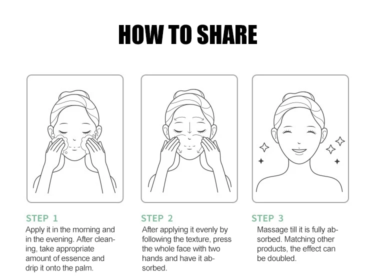 ▶Шаг 1: Нанесите его утром и вечером. После очистки Возьмите необходимое количество эссенции и капните его на ладонь.