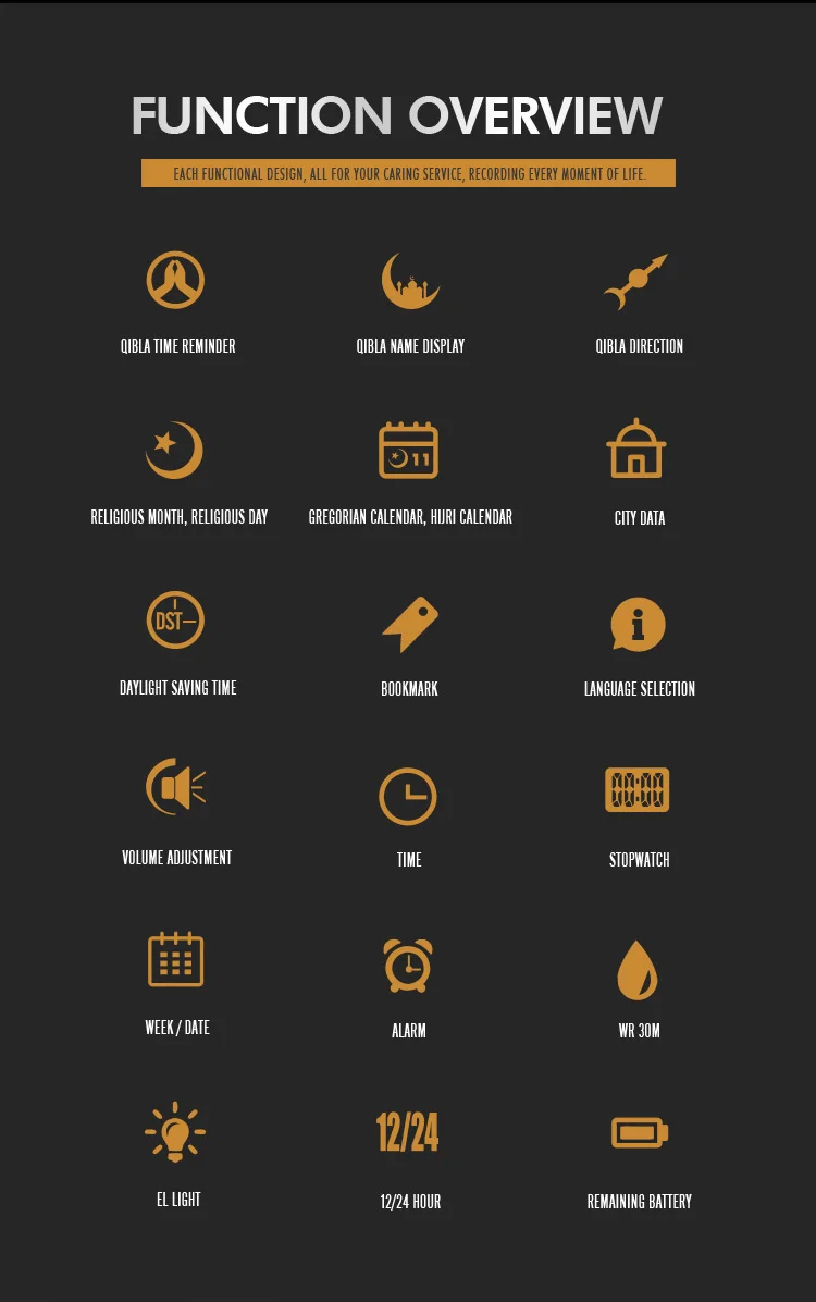 8.Function: Pilgrimage time reminder, Qibla name display, Qibla direction, Religious month, religious day, Gregorian calendar, Hijri calendar, City data, summer time, bookmark, language selection, volume adjustment, remaining battery, time, chrono, alarm, date, week, EL light, 12/24 hour clock