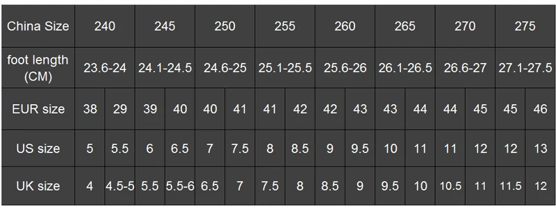 Внутри обуви Длина: 39: 24,5 см/9,65 ", 40: 25 см/9,84", 41: 25,5 см/10,04 ", 42: 26 см/10,24", 43: 26,5 см/10,43 ", 44: 27 см/10,63", 45: 27,5 см/10,83 "(прибл.)