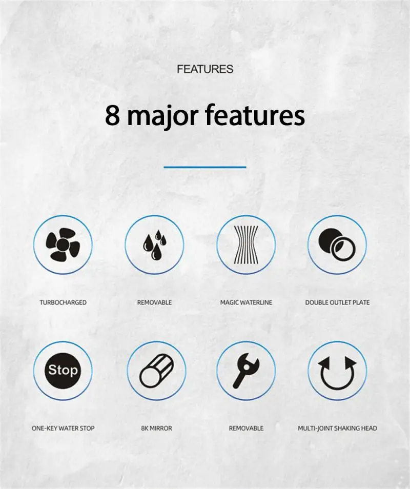 Особенности: одна кнопка остановки воды, турбонаддув воды выход, съемный для очистки, вращение на 360 градусов, двусторонняя Замена водного выхода пластины