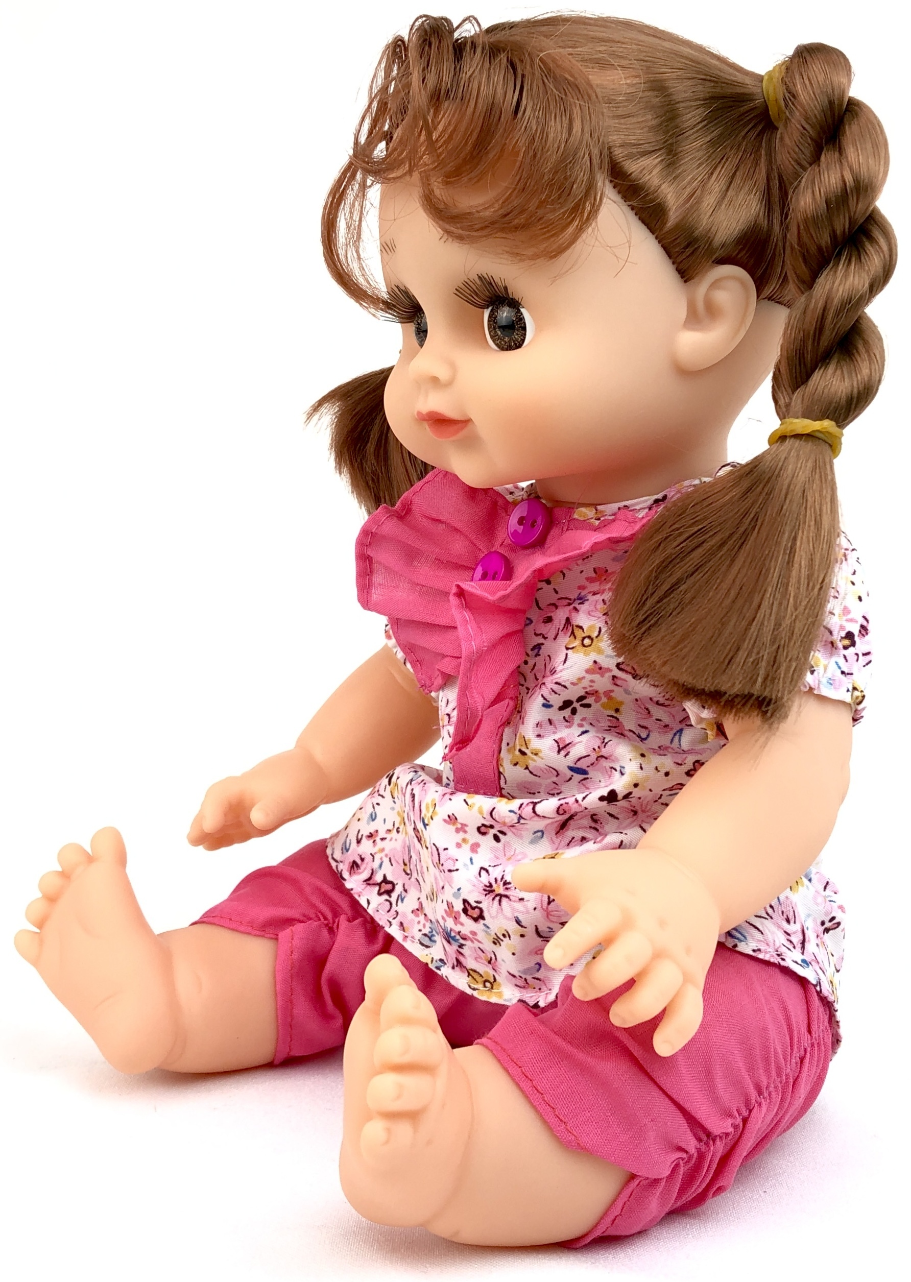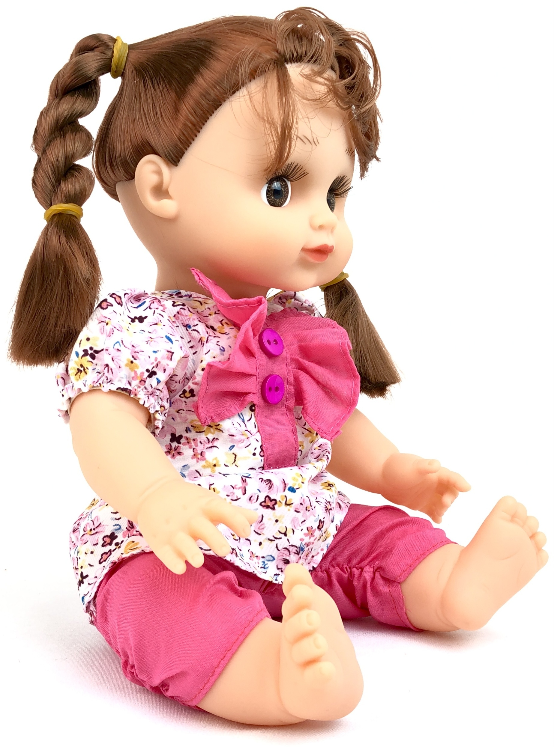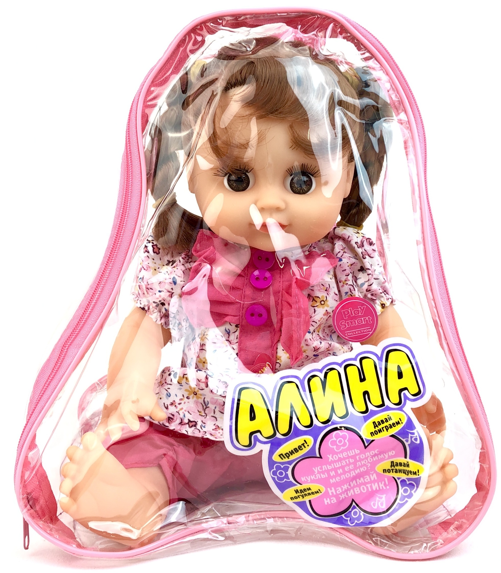 Игрушка может говорить и петь. Достаточно нажать на животик куклы и последуют фразы: