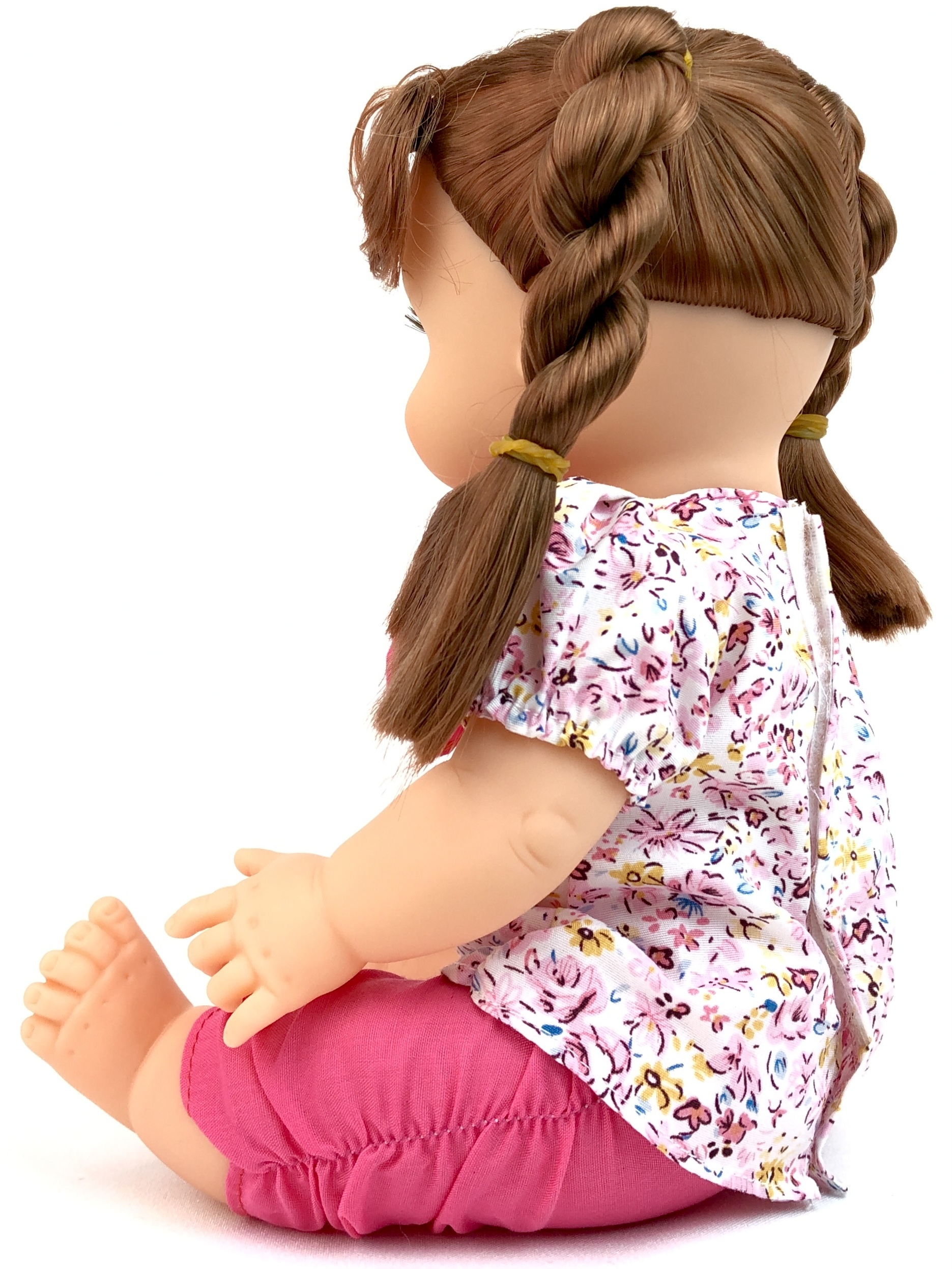 Симпатичная кукла одета в тунику и яркие штанишки.