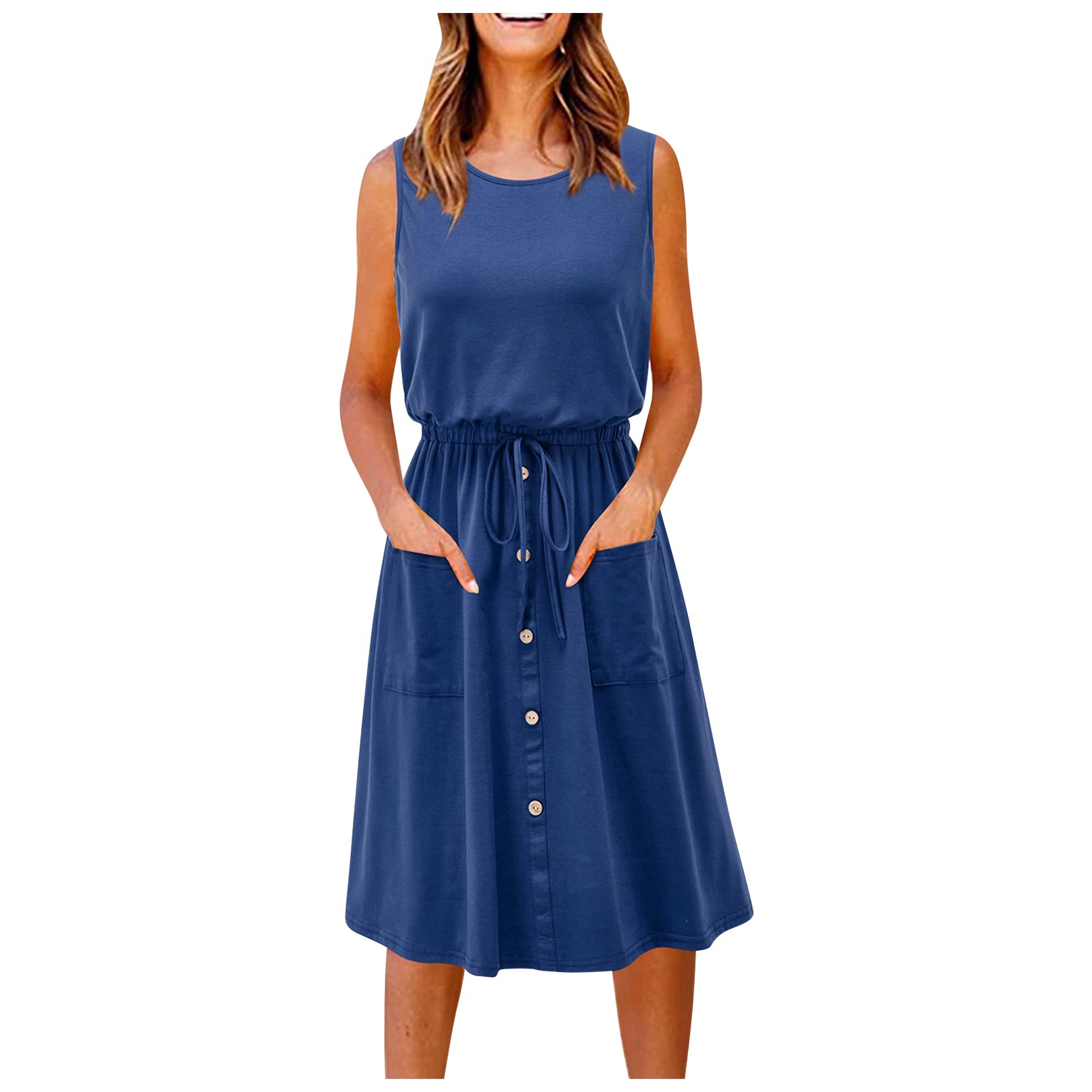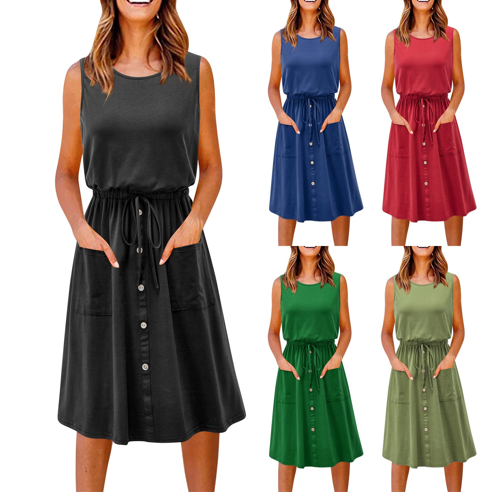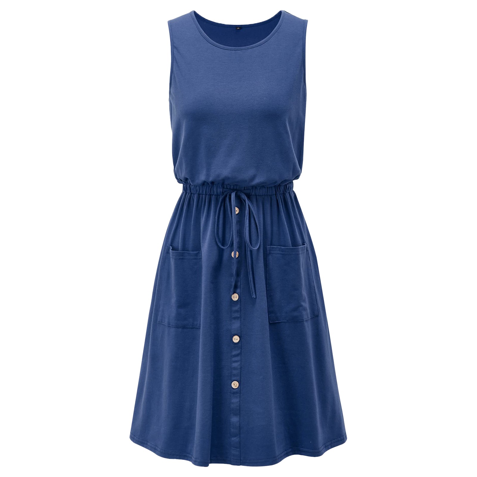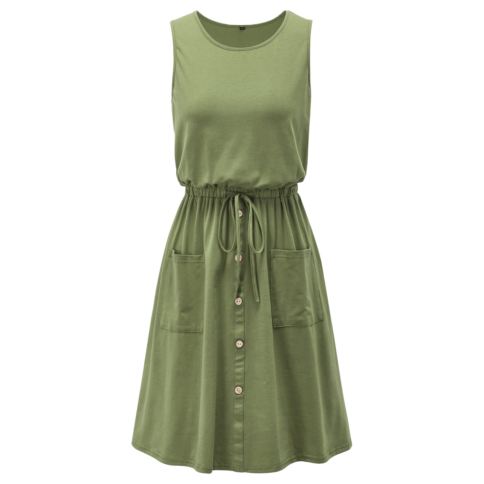 Women's Casual Fashion Solid Color Round Neck Drawstring Sleeveless Dress