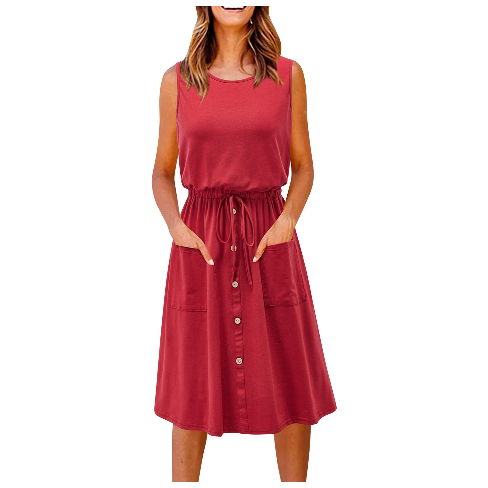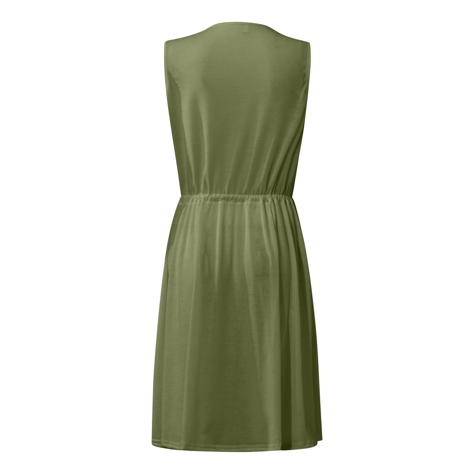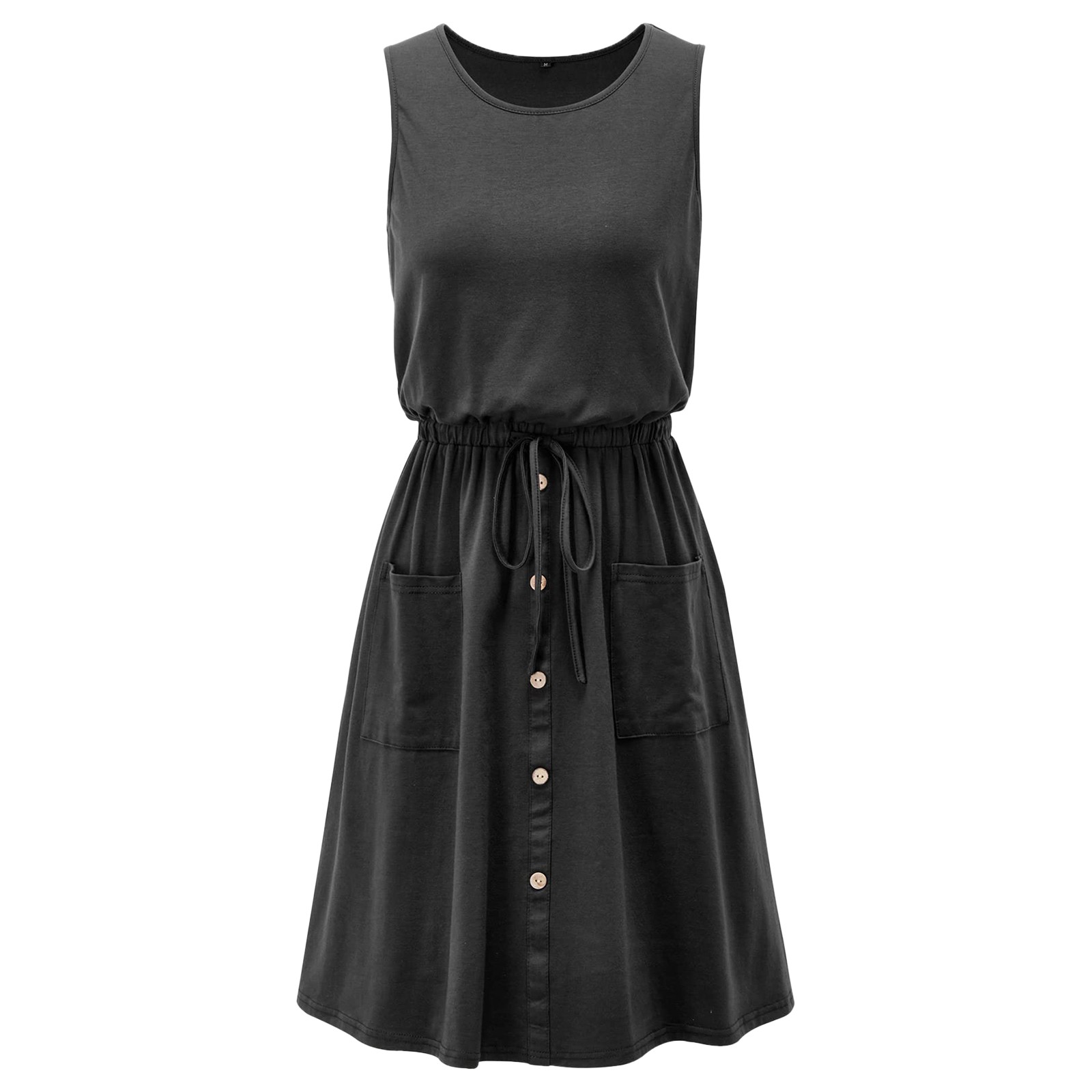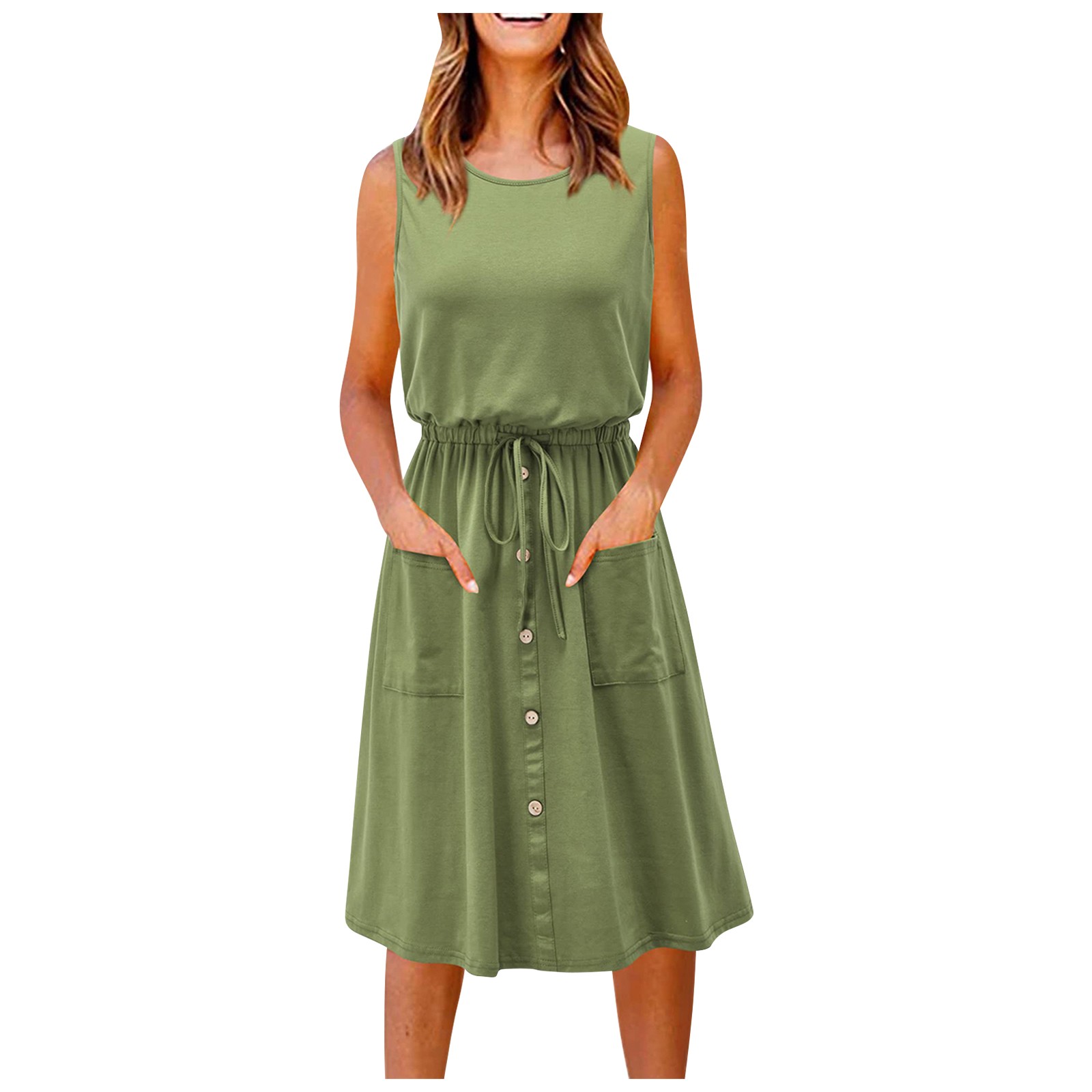 Women's Casual Fashion Solid Color Round Neck Drawstring Sleeveless Dress