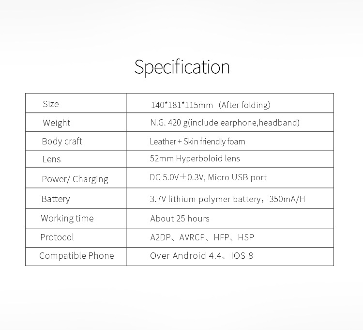 Headphone battery 3.7V lithium polymer battery, 350mA/H; power supply/charging DC 5.0V±0.3V; Micro USB interface, charging ≈ 2.5 hours, use ≈ 24 hours