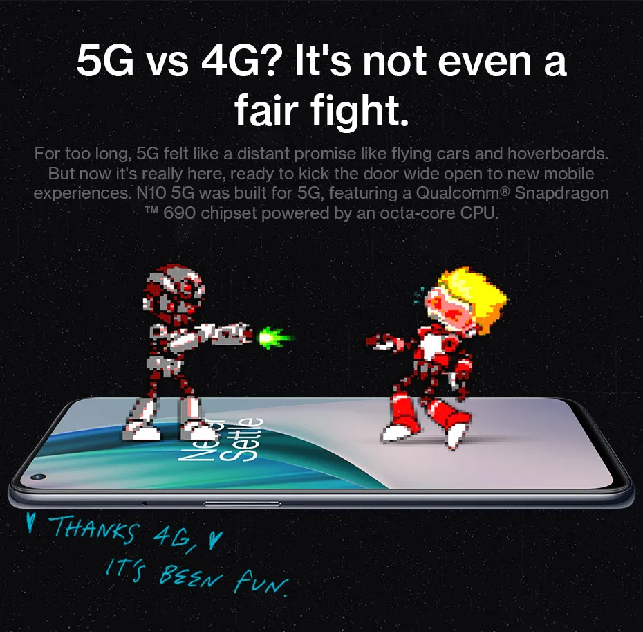 Наконец-то пришло время перейти к следующей главе мобильной технологии-5G. 5G N10 упаковывает мощный удар, показывающий Qualcomm®Snapdragon™690 чипсет, оснащенный восьмиядерным процессором, позволяет достичь мощной 5G скорости.
