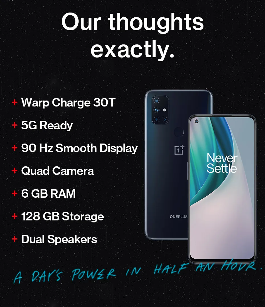 * На основании внутреннего OnePlus тестирования, 30 минут Warp заряжайте 30T заряжает OnePlus Nord N10 5G для 1%-67% батареи, которая используется для 6,5 часов под OnePlus Доу (день пользования) модель. Срок службы батареи будет зависеть от настроек и фактического использования. Фактическая производительность, с которой сталкиваются пользователи, может варьироваться в зависимости от конкретных условий зарядки;