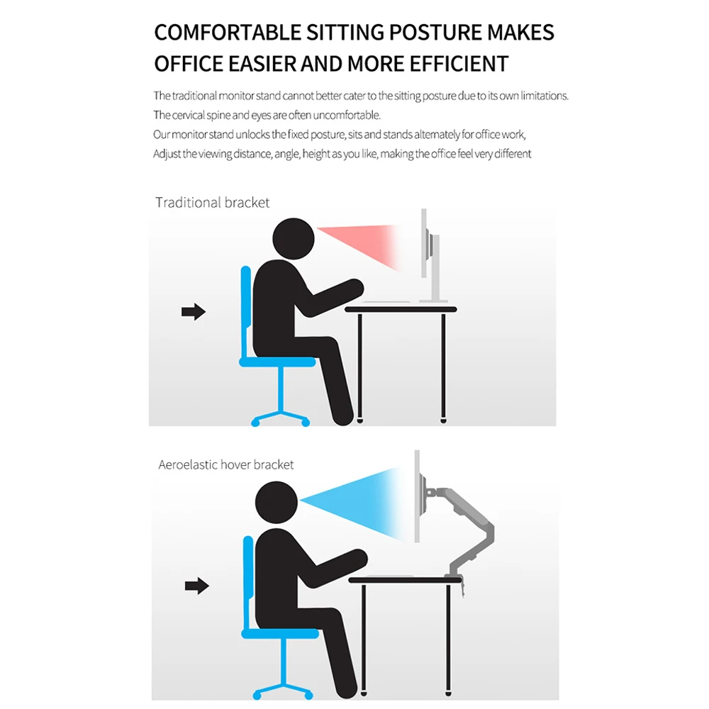 2. Традиционная подставка для монитора не может лучше соответствовать позе сидя из-за своих ограничений, а шейный отдел позвоночника и очки часто чувствуют себя некомфортно. Этот монитор поддерживает фиксированную осанку, чередуется между сидением и стоя и регулирует расстояние обзора, угол и высоту по желанию, а офисный опыт очень отличается.
