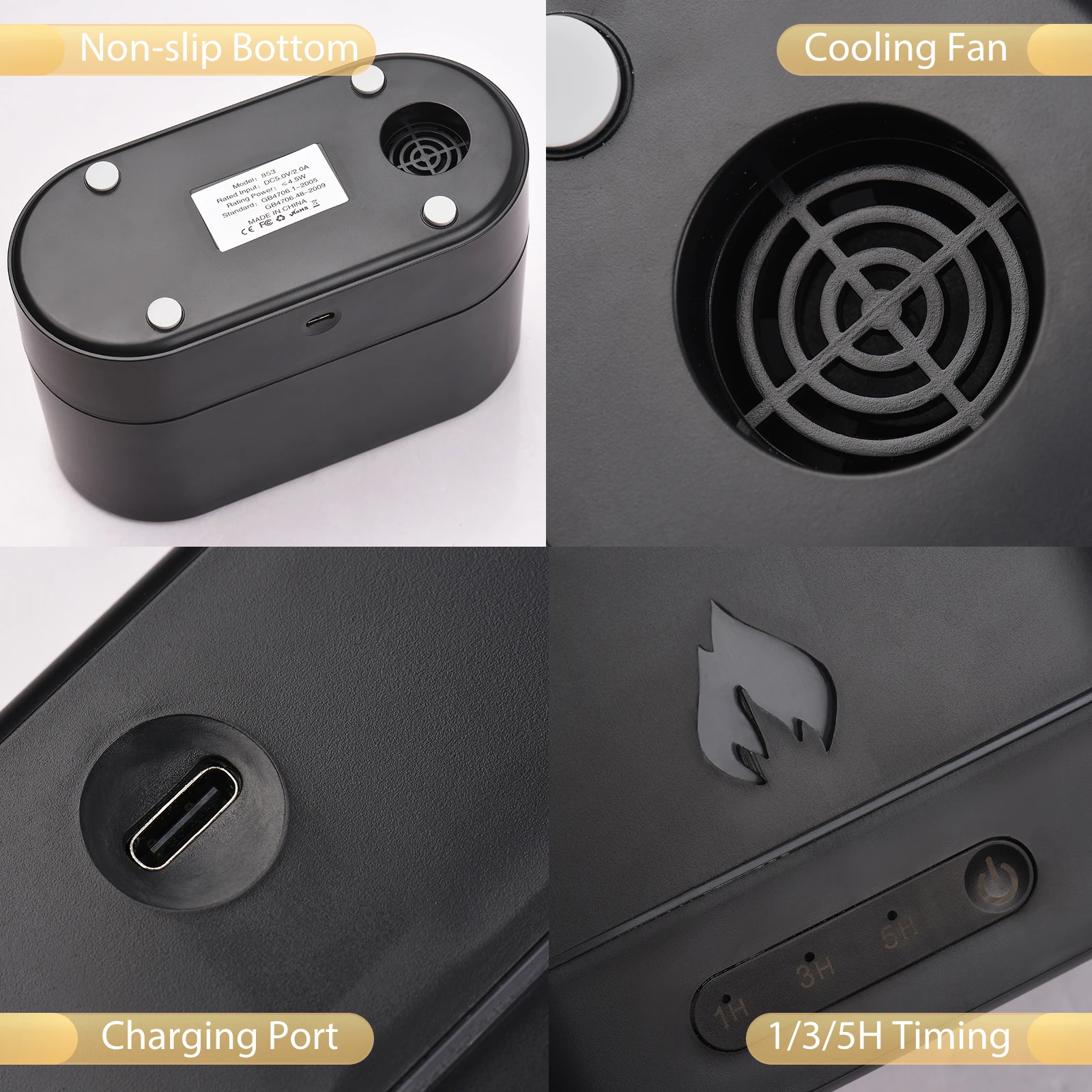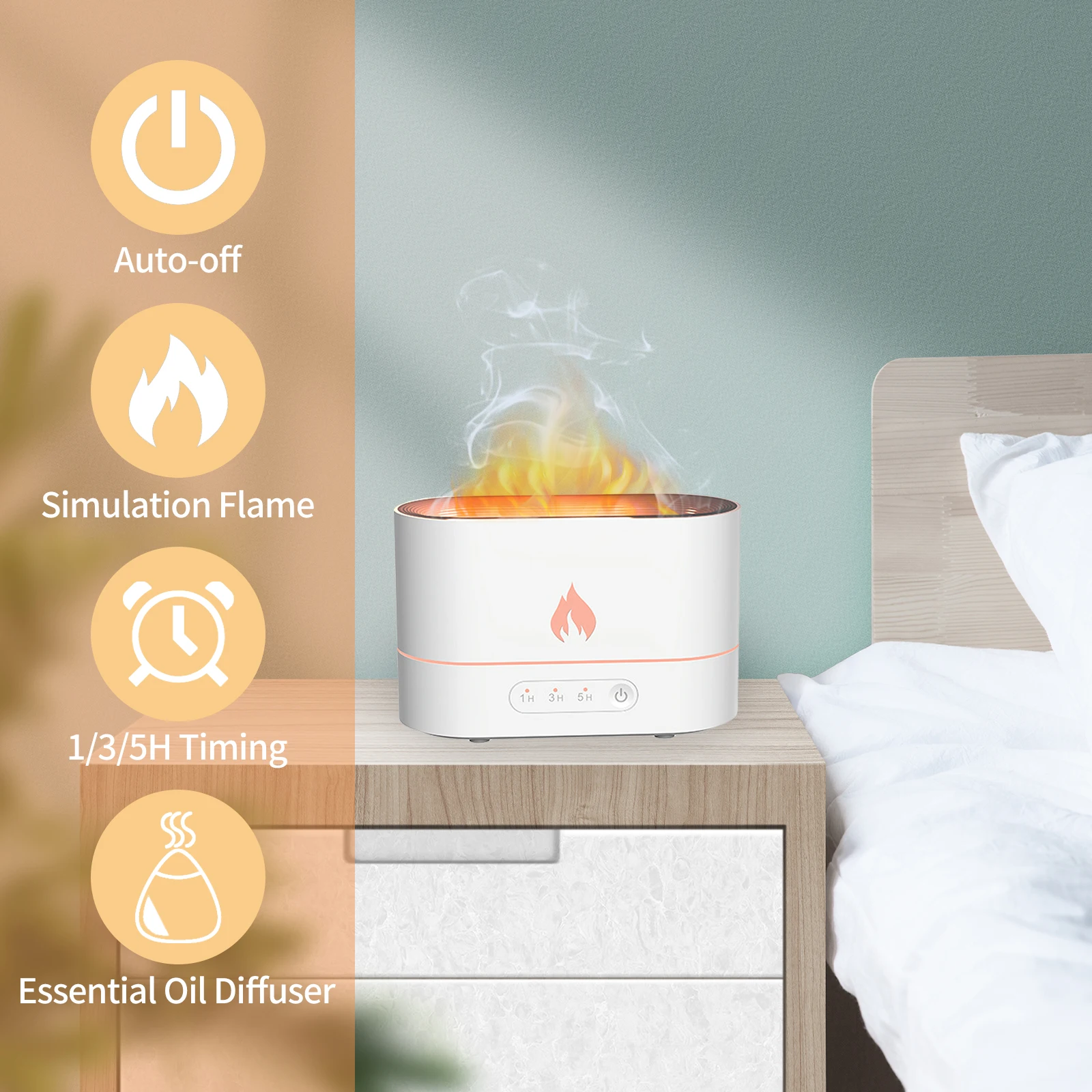 Распылитель для ароматерапии был спроектирован-светодиодный светильник в сочетании с туманом, он покажет реалистичный эффект пламени, который приносит атмосферу романтики и исцеления ночью. Он может увлажнить воздух на 360 ° равномерное увлажнение, так что вы можете дышать свежим воздухом, пахнет свежим воздухом, как вы находитесь в лесу.