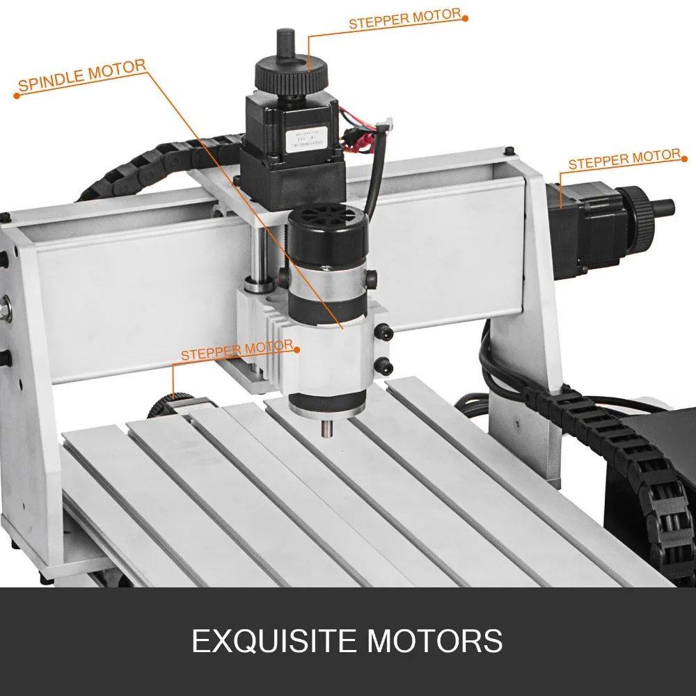 Оснащен 57 двухфазным шаговым двигателем (2A) на каждой из трех осей для легкого движения, которые надежно соединены внешними муфтами для передачи высокого крутящего момента. И ручки с небольшими ручками на шаговых двигателях могут осуществлять регулировку положения. 300 Вт мотор шпинделя на оси Z находится в оригинальном состоянии и упаковке со скоростью 8000 об./мин. (бесступенчатое регулирование скорости).