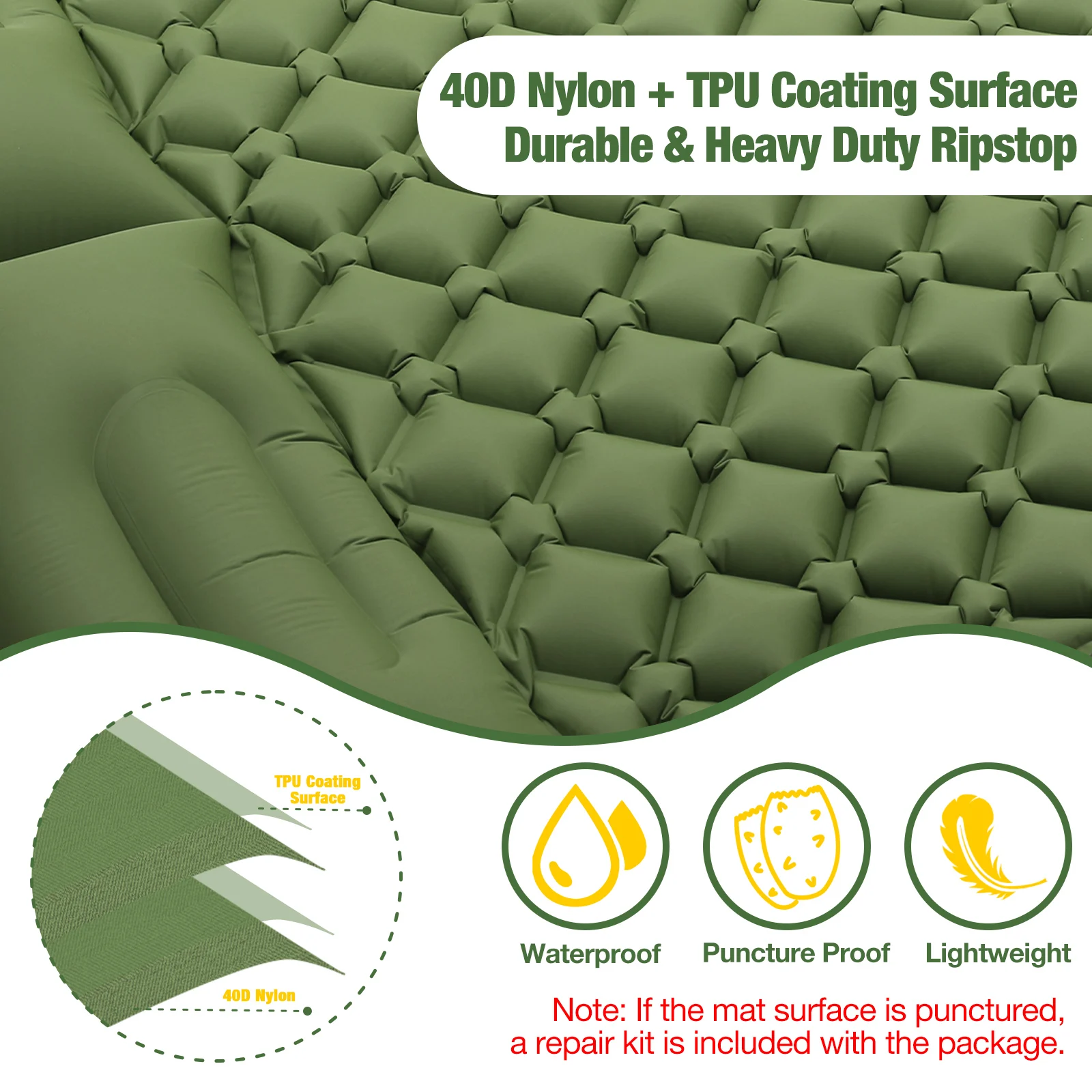 Надежная конструкция: хорошо сделано с 40D нейлоном + 0.1TPU покрытием поверхности для сопротивления разрыву и долговечности. Этот спальный коврик для выживания поможет вам в чрезвычайной ситуации. (Советы: если эта прокладка случайно проколется, есть набор для ремонта, который входит в комплект.)