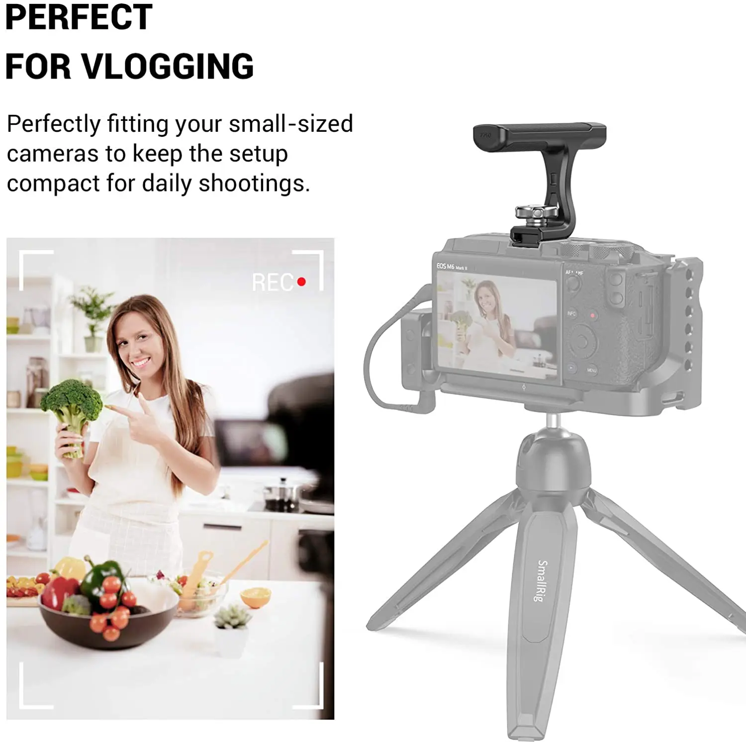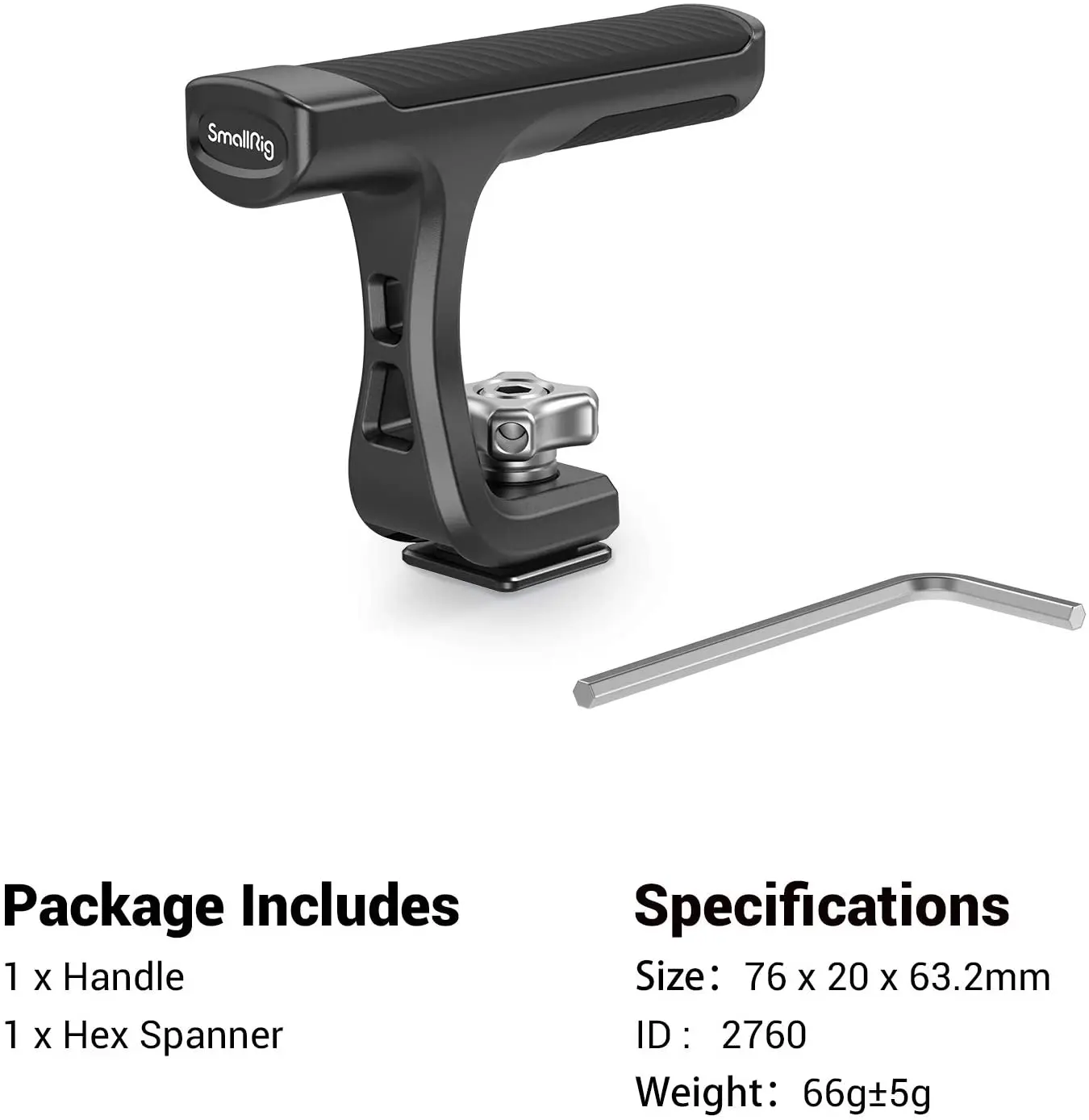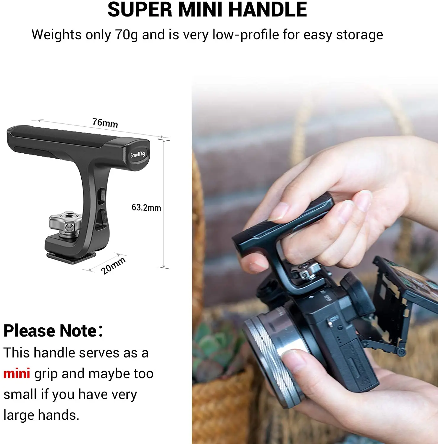 Мини-ручка SmallRig для камер с креплением на Холодный башмак (светильник) 2760 Эргономичная форма для комфортного съемки. Он изготовлен из твердого алюминия и покрыт нескользящим мягким силиконом. Быстро крепится на горячий башмак камеры или Холодный башмак на верхней части клетки и затягивается винтом, он идеально подходит для ваших небольших камер, чтобы сохранить настройку компактной для ежедневных съемок. В посылка входит шестигранный ключ для усиления винта. Ручка весит всего 66 г и очень Низкопрофильная для удобного хранения.