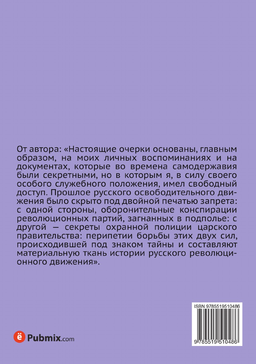 От автора: "Настоящие очерки основаны, главным образом, на моих личных воспоминаниях и на документах, которые во времена самодержавия были секретными, но в которым я, в силу своего особого служебного положения, имел свободный доступ. Прошлое русского освободительного движения было скрыто под двойной печатью запрета: с одной стороны, оборонительные конспирации революционных партий, загнанных в подполье: с другой - секреты охранной полиции царского правительства: перипетии борьбы этих двух сил, происходившей под знаком тайны и составляют материальную ткань истории русского революционного движения."