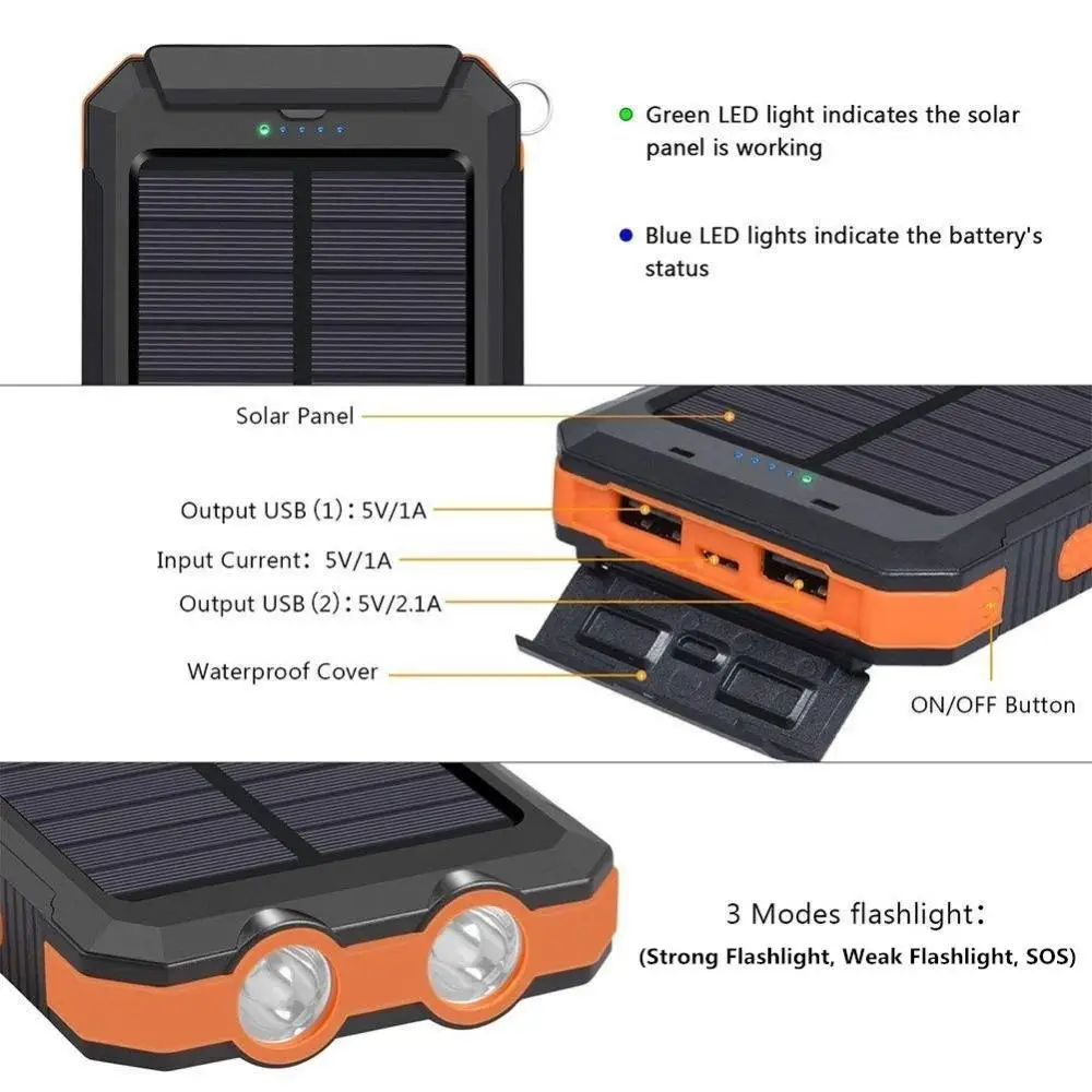 8. Двойной выход USB DC 5v/2.1a (одно устройство, максимальный выход 2.1a), dc 5v/1a (два устройства, каждый выход 1a) USB порт для планшета, других смартфонов или других электронных устройств. DC 5V/1.5A USB вход для быстрой зарядки самого солнечного блока питания. Позволяет заряжать два устройства одновременно, солнечное зарядное устройство обеспечивает отличное удобство для вас и ваших друзей, которым нужны услуги зарядки