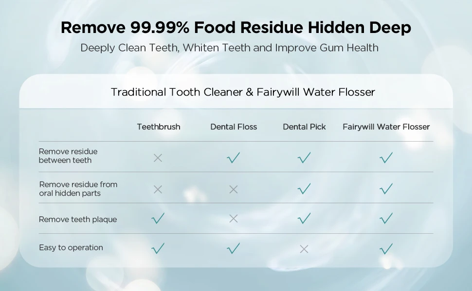 Водяная нить Fairywill-это самый простой и эффективный инструмент для очистки остатков пищи во рту. Он может удалить до 99.9% зубного налета и подходит для брекетов, имплантатов и других стоматологических работ. Начинающий или пародонтальный клиент может начать с низкого давления. Мощное давление позволит получить все, что было между зубами.