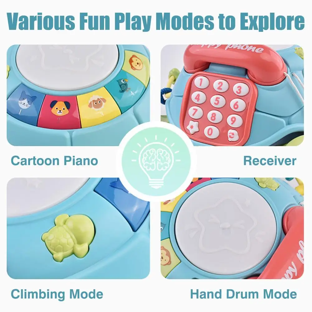 Различные режимы веселой игры для изучения: погоня за ползающей черепашкой, играя в ручной барабан, набрав номер телефона, колыбельные, животные и 5 звуковых эффектов музыкального инструмента, вращающиеся бусины. Ваш малыш не сможет держать глаза и руки от этих музыкальных игрушек.