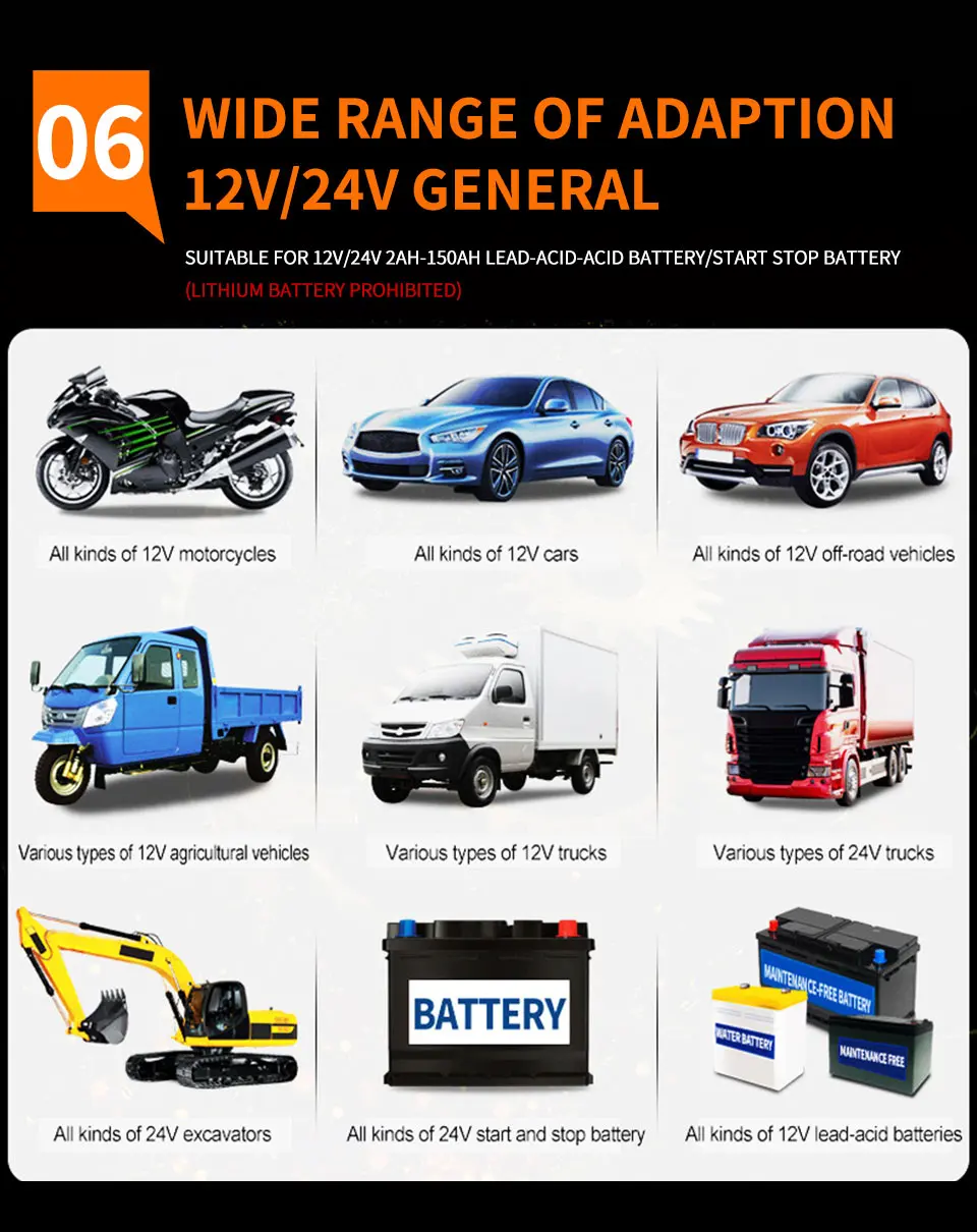 5. Типы батарей: большинство типов свинцово-кислотных батарей, включая кальций, гель и AGM, влажные, EFB и т. Д.