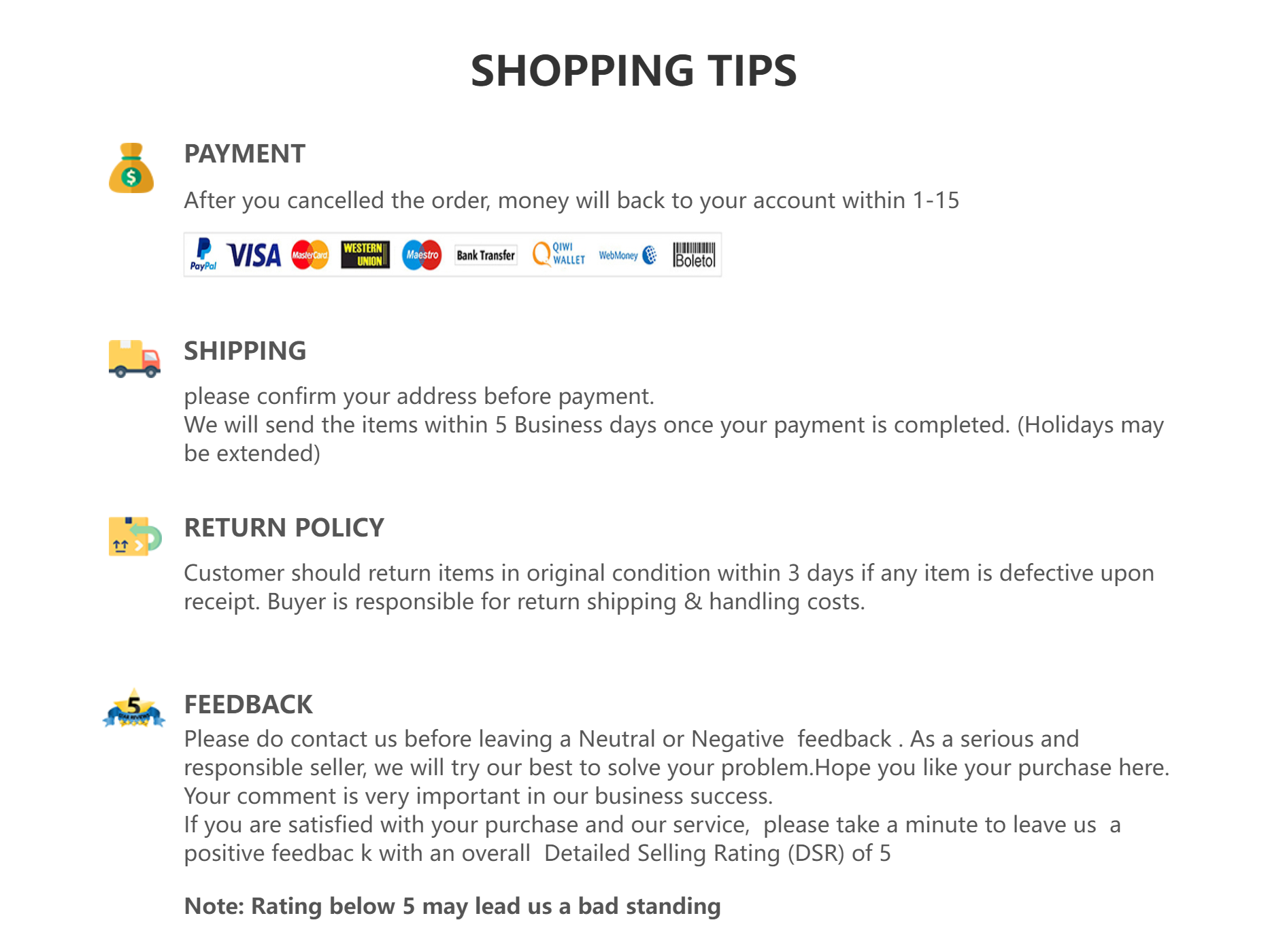 Мы поддерживаем высокие стандарты качества и стремимся к 100% удовлетворенности клиентов! Отзывы очень важно, мы просим Вас немедленно связаться с нами, прежде чем предоставить нам нейтральный или отрицательный отзывы, чтобы мы могли удовлетворительно решить ваши проблемы.