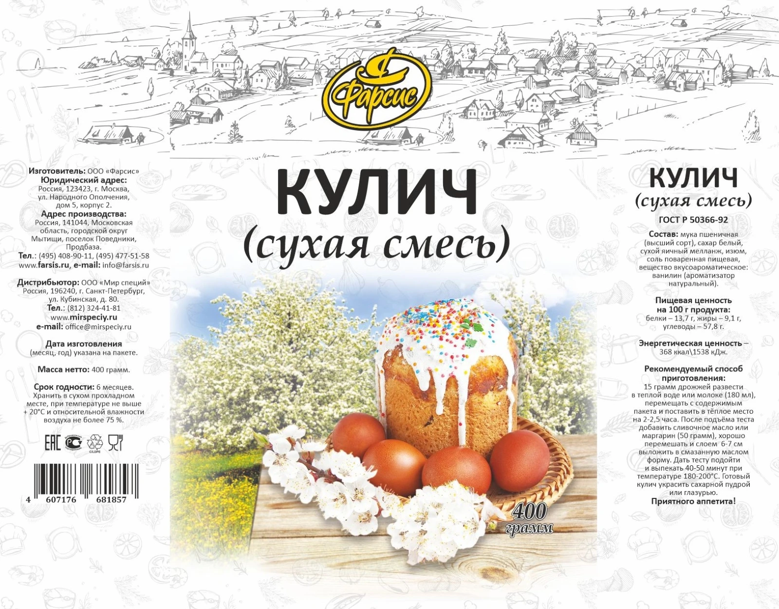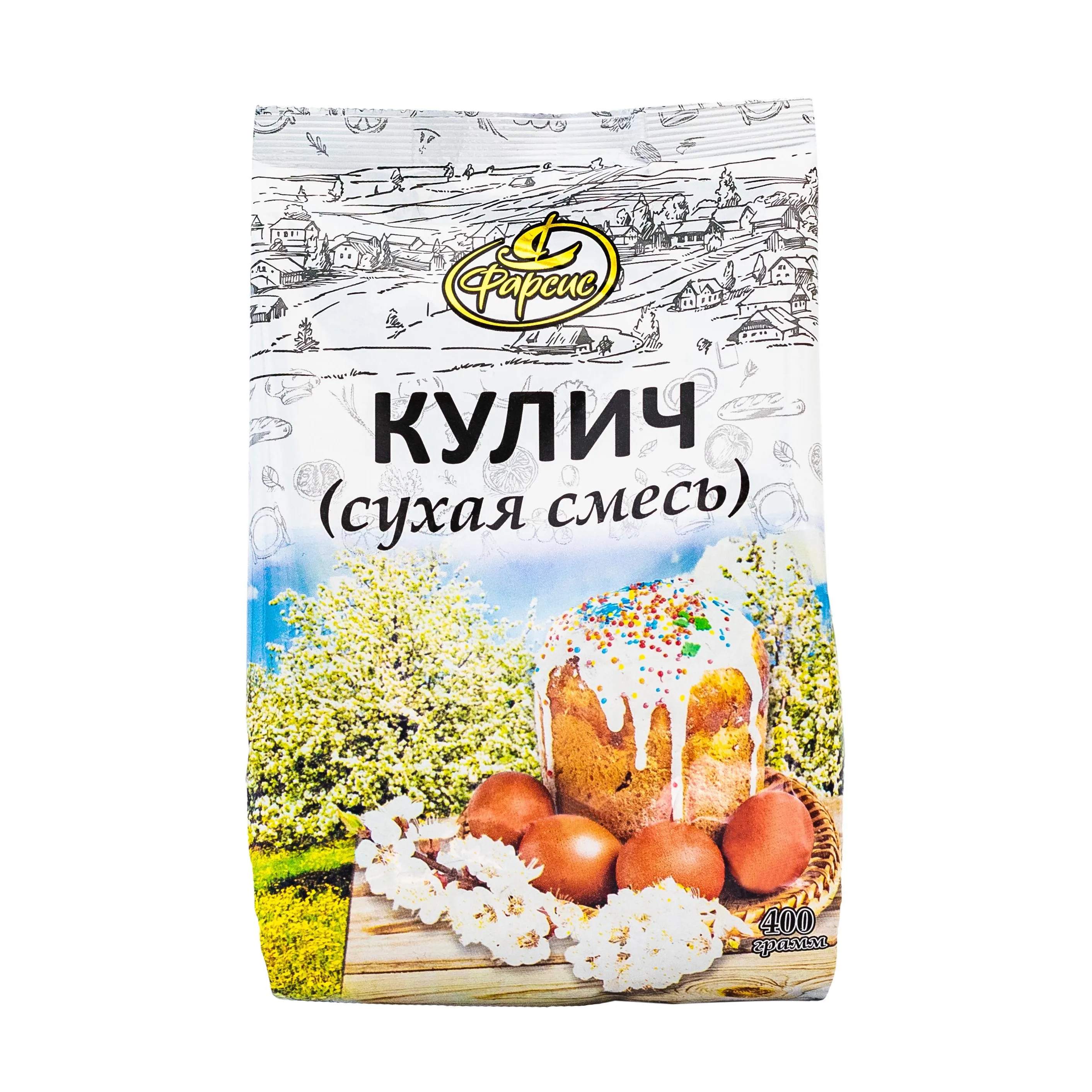 ОписаниеГотовая сухая смесь для приготовления традиционного пасхального кулича. Рекомендуемый способ приготовления: 15 грамм дрожжей развести в теплой воде или молоке (180 мл) перемещать с содержимым пакета и поставить в теплое место на 2-2,5 часа. После подъема теста добавить сливочное масло или маргарин (50 грамм), хорошо перемешать и слоем 6-7 см выложить в смазанную маслом форму. Дать тесту подойти и выпекать 40-50 минут при температуре 180С-200С . Готовый кулич украсить сахарной пудрой или глазурью.