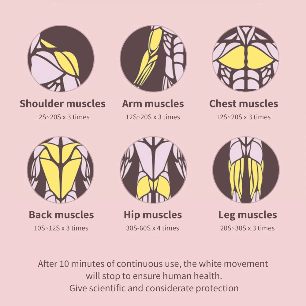 6. Время Использования Массажного пистолета варьируется в зависимости от различных частей. Во избежание длительного массажа и повреждения мышц и костей той же части, пистолет fascia оснащен умной функцией защиты времени. После непрерывного использования в течение 15 минут, он прекратится автоматически, чтобы обеспечить научную и продуманную защиту.