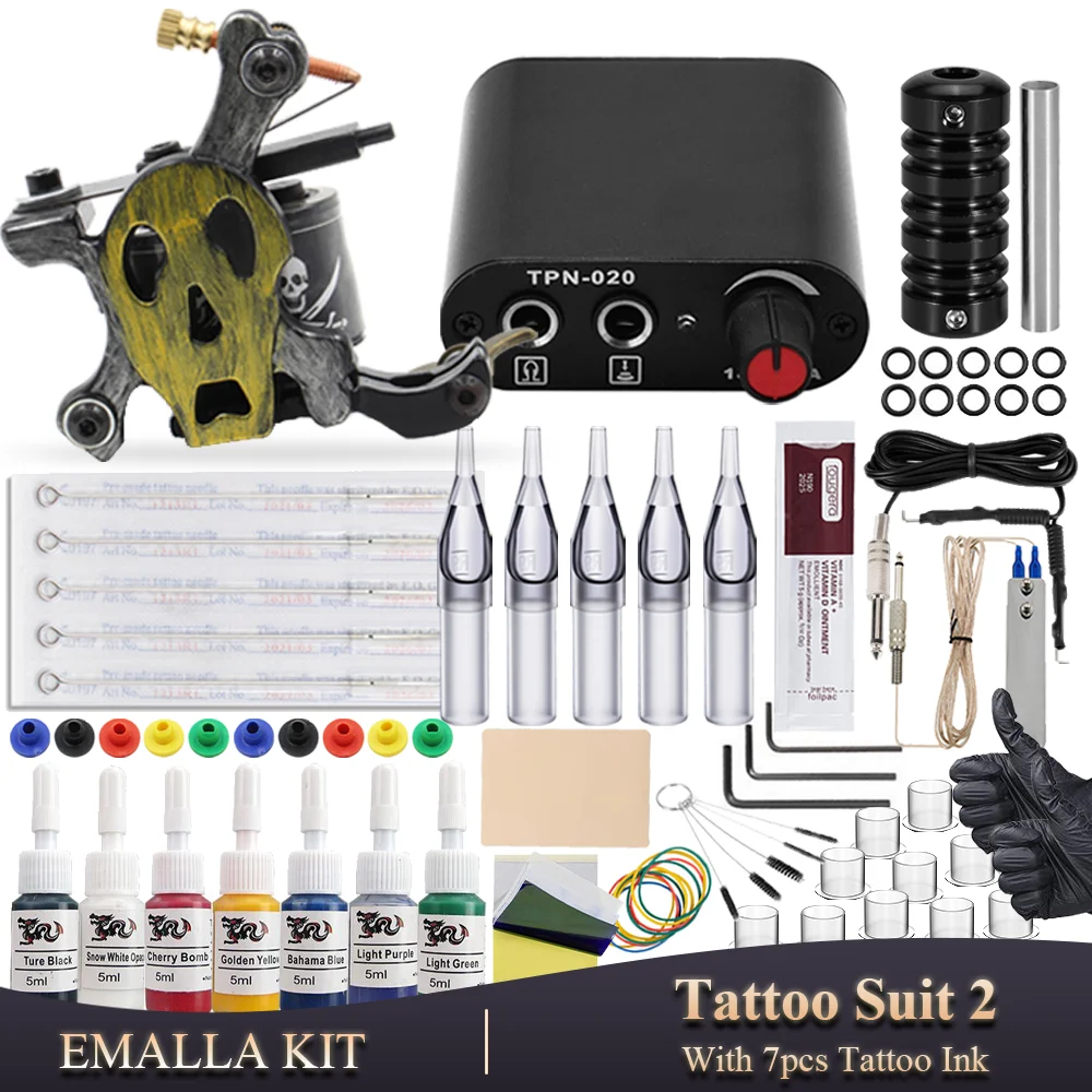 Набор татуировок EMALLA для начинающих, полный набор тату-машин, катушка черепа, пистолет, чернила, блок питания, ручки, инструмент для боди-арта, Перманентный набор для макияжа