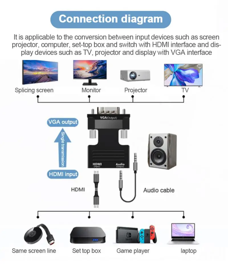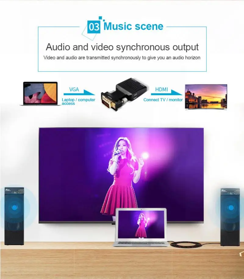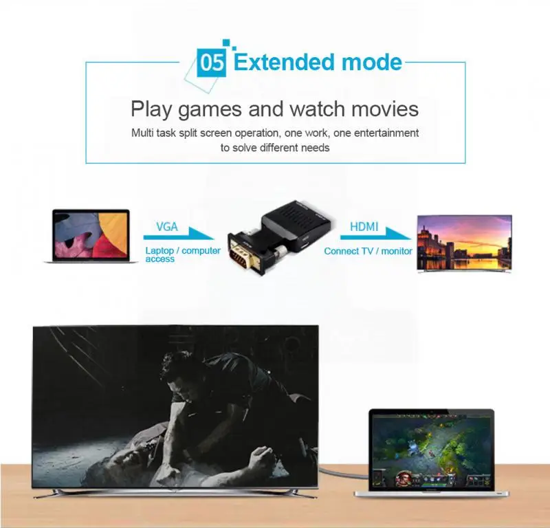 1.It is used to convert VGA video and 3.5mm analogue audio signal in your computer to -compatible signal and display it on the large screen of the HDTV