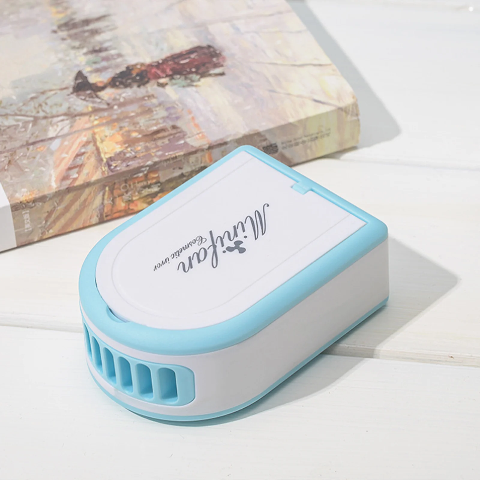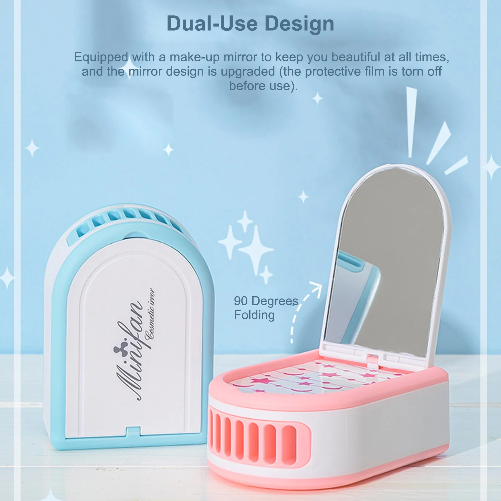 Мини-вентилятор оснащен косметическим зеркалом, чтобы вы всегда были красивы, а дизайн зеркала обновлен (защитная пленка оторвана перед использованием).