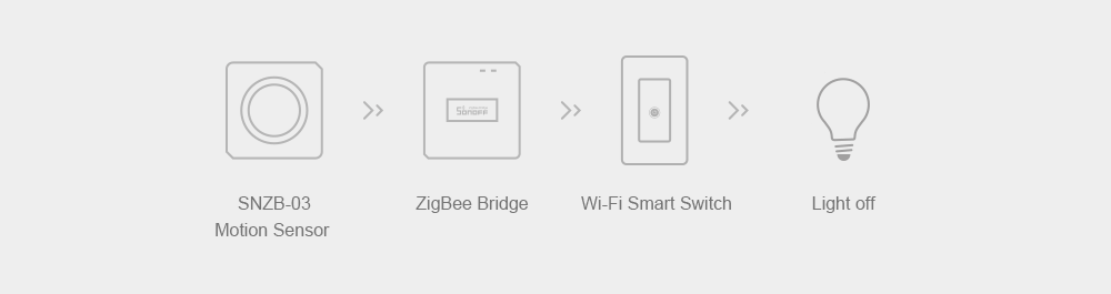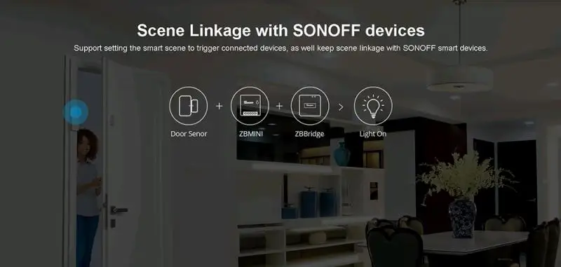 Работает с датчиком движения witch SONOFF SNZB-03, чтобы ваш светильник гостиной автоматически включался, когда вы входите в гостиную вечером, без темноты перед вами.