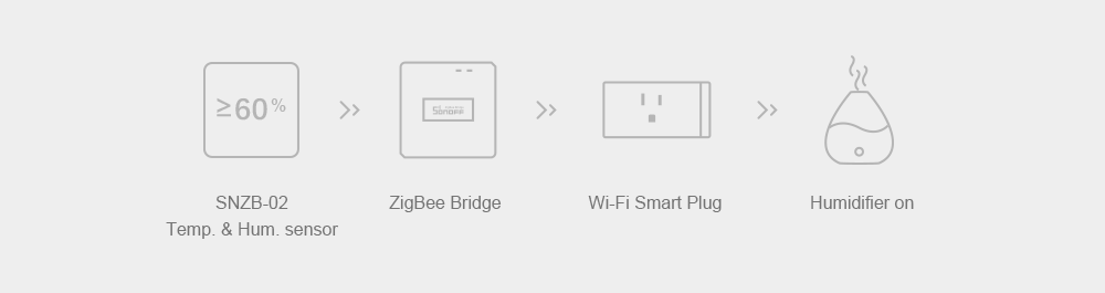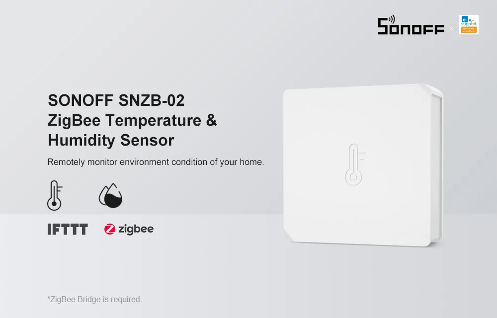 Подключите мост к SONOFF SNZB-02 Tem.& Hum. Датчик для определения температуры в реальном времени и влажности вашего дома, затем вы можете включить/выключить вентилятор или увлажнение, чтобы изменить комфортный уровень.